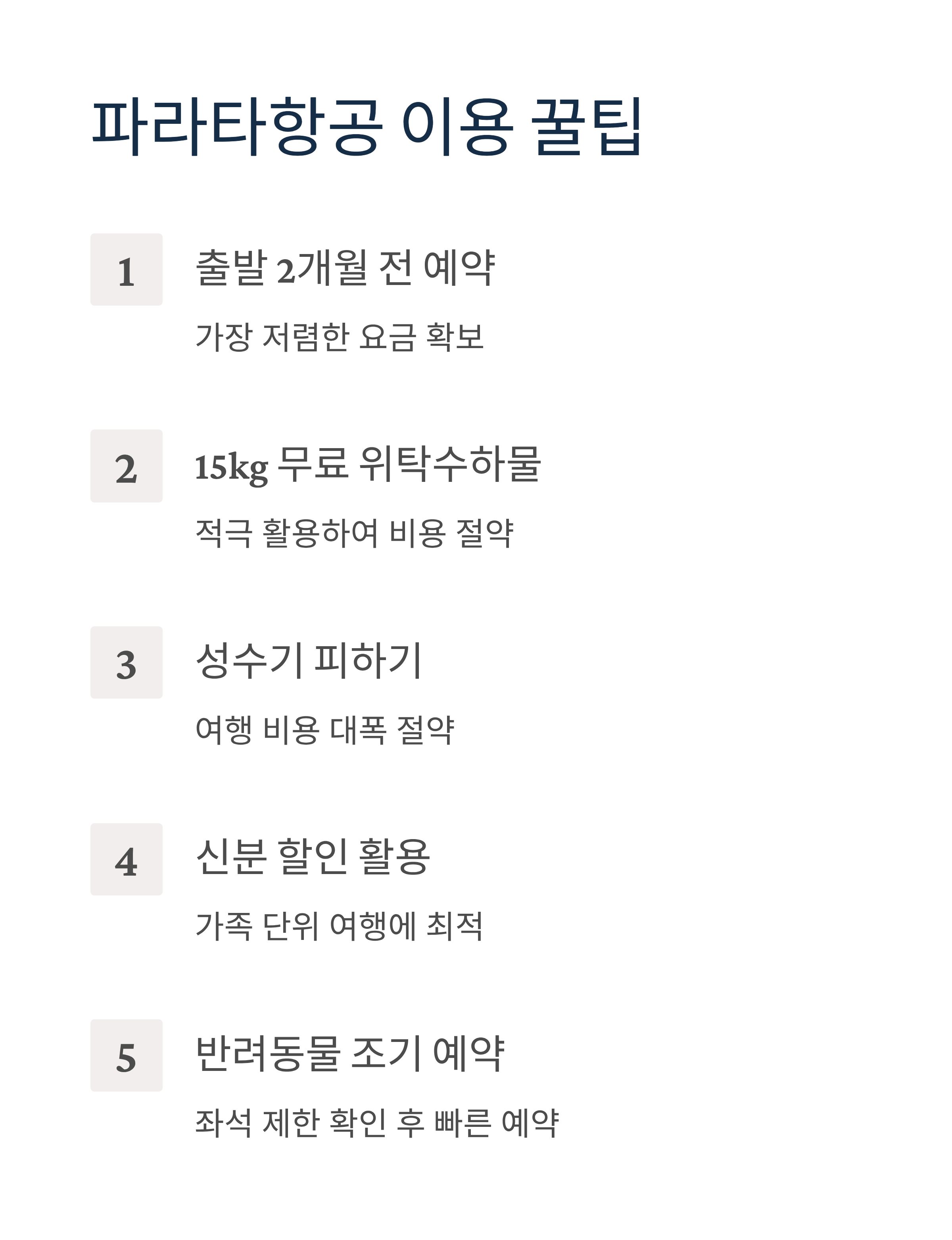 파라타항공은 성수기 시즌을 별도로 지정해 요금을 운영합니다. 가까운 성수기 일정은 다음과 같습니다.