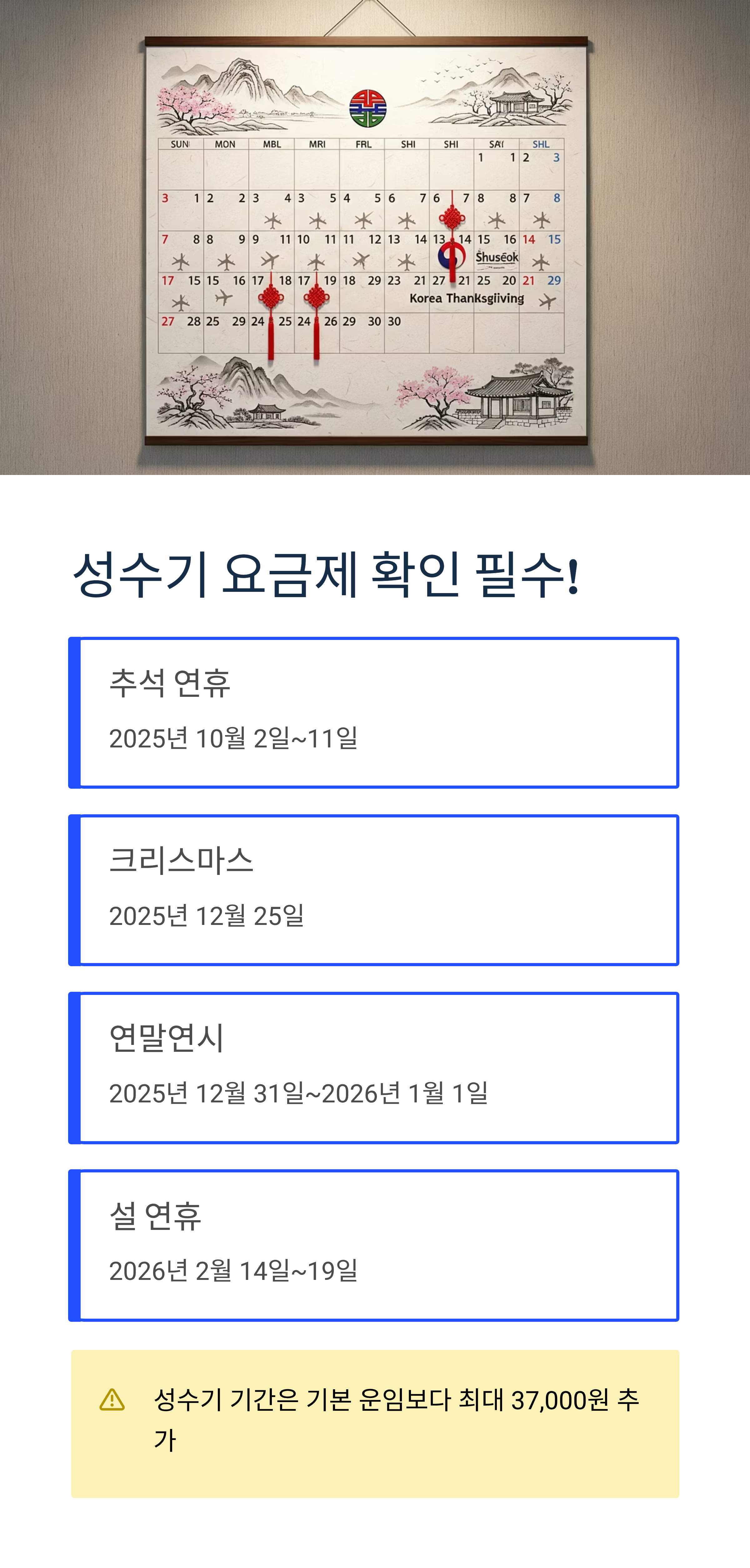 👉 성수기 기간은 기본 운임보다 최대 37,000원 이상 비싸지므로, 조기 예약이 필수입니다.