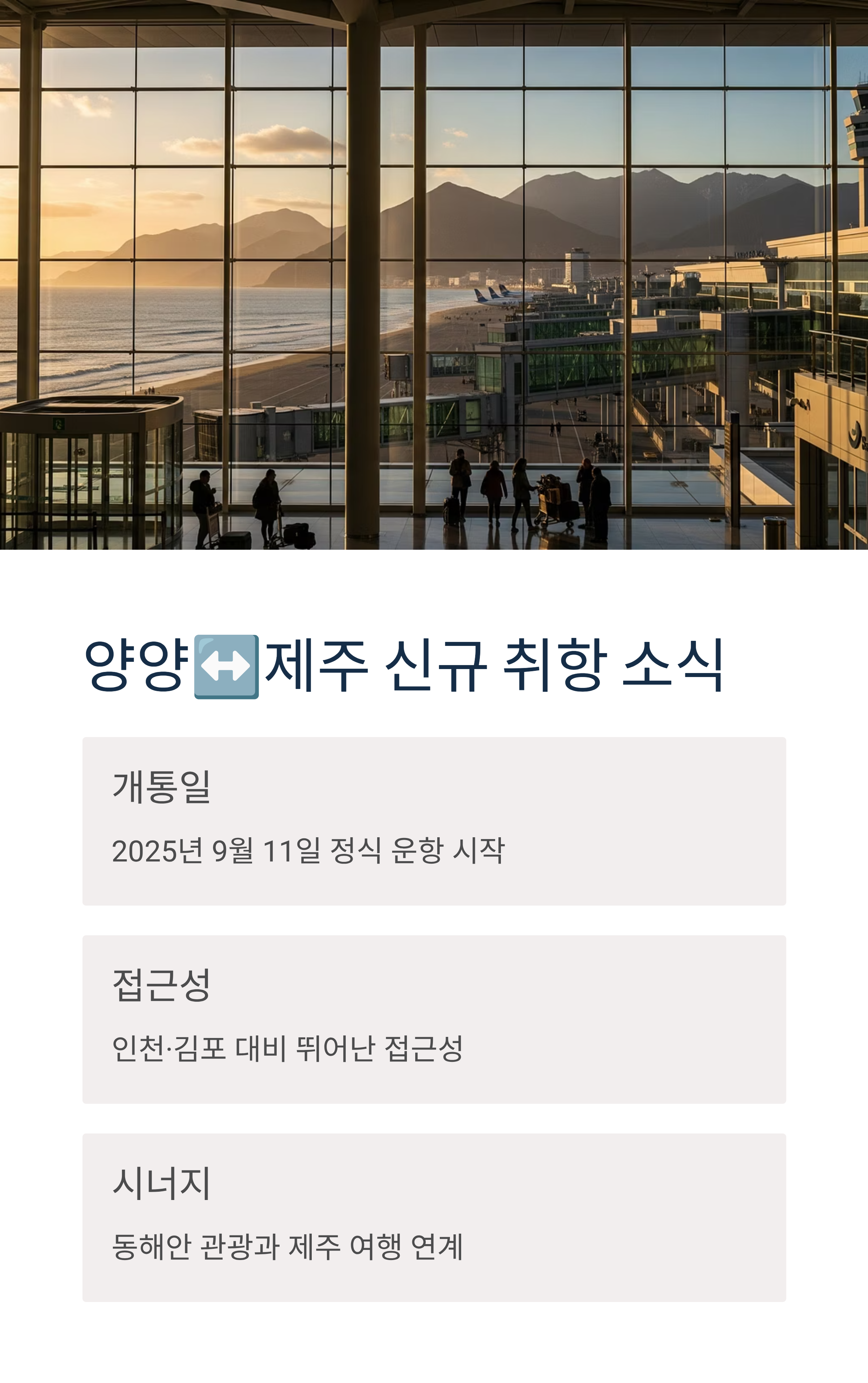 강원도민과 수도권 동북부 여행객들에게 희소식이 찾아왔습니다. 2025년 9월 11일부터 파라타항공이 양양공항과 제주공항을 오가는 노선을 정식으로 개통합니다.