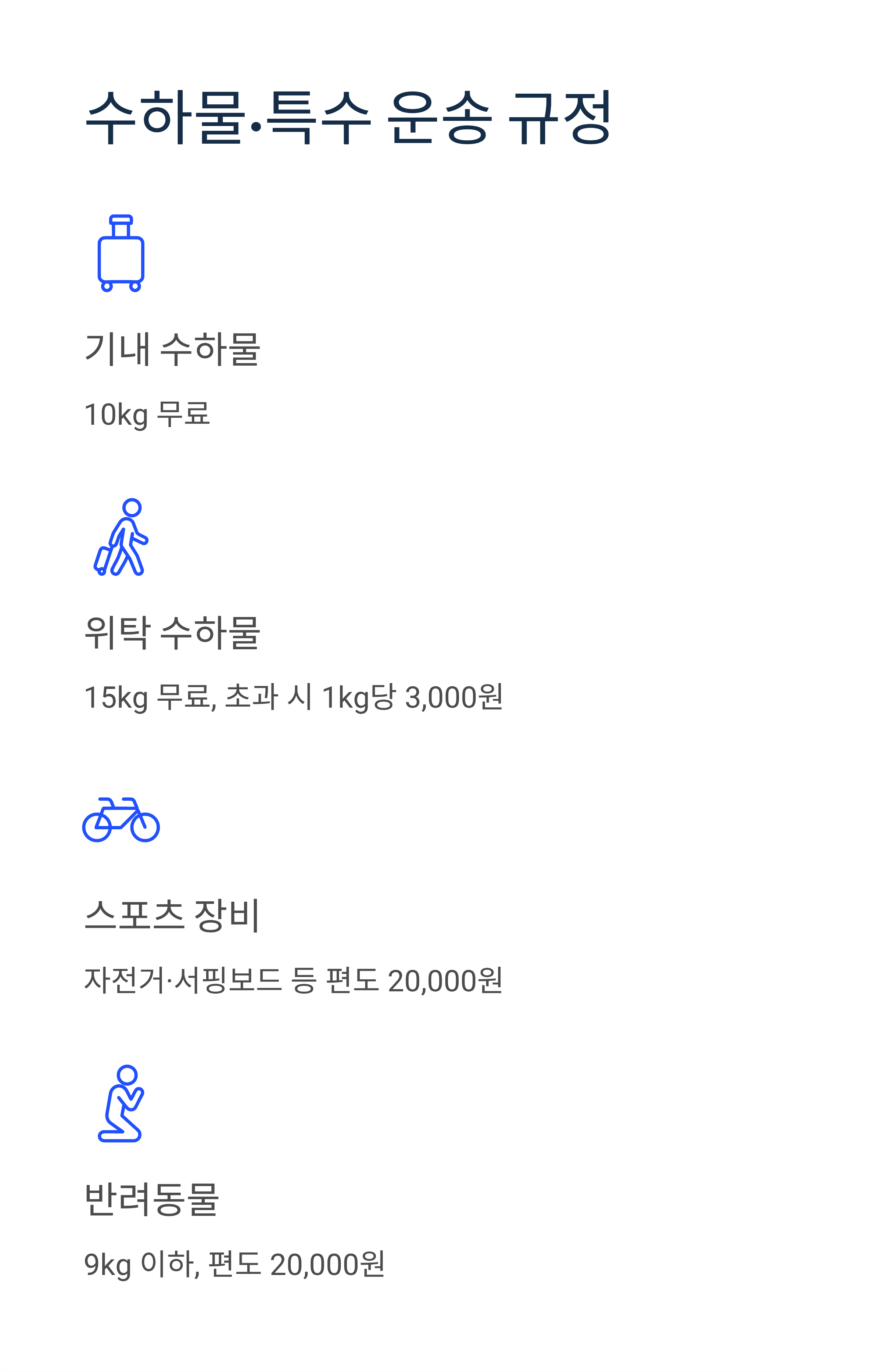 위탁 수하물: 15kg 무료 (초과 시 1kg당 3,000원)