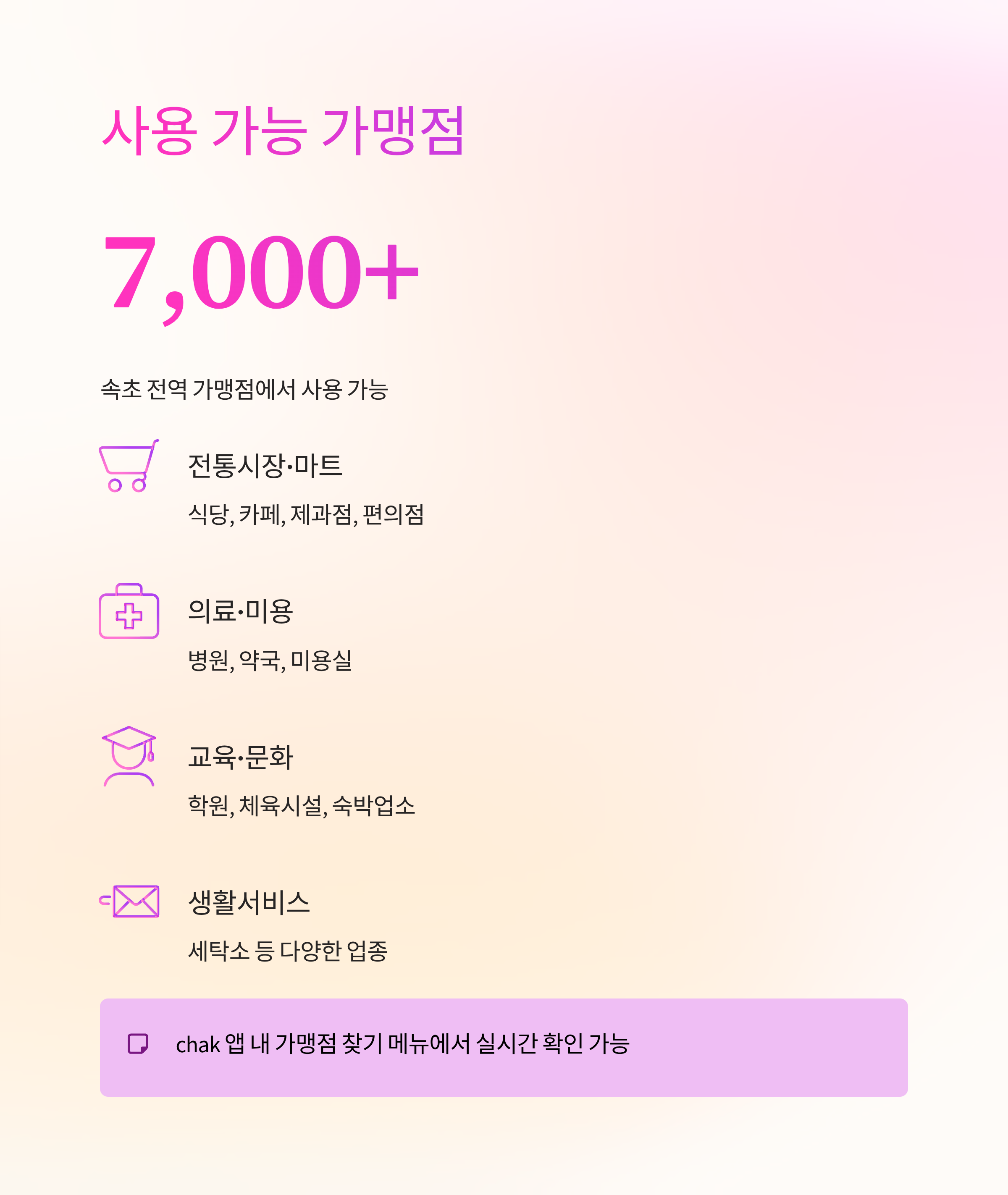 정확한 사용처는 chak 앱 내 가맹점 찾기 메뉴에서 실시간으로 확인 가능합니다.