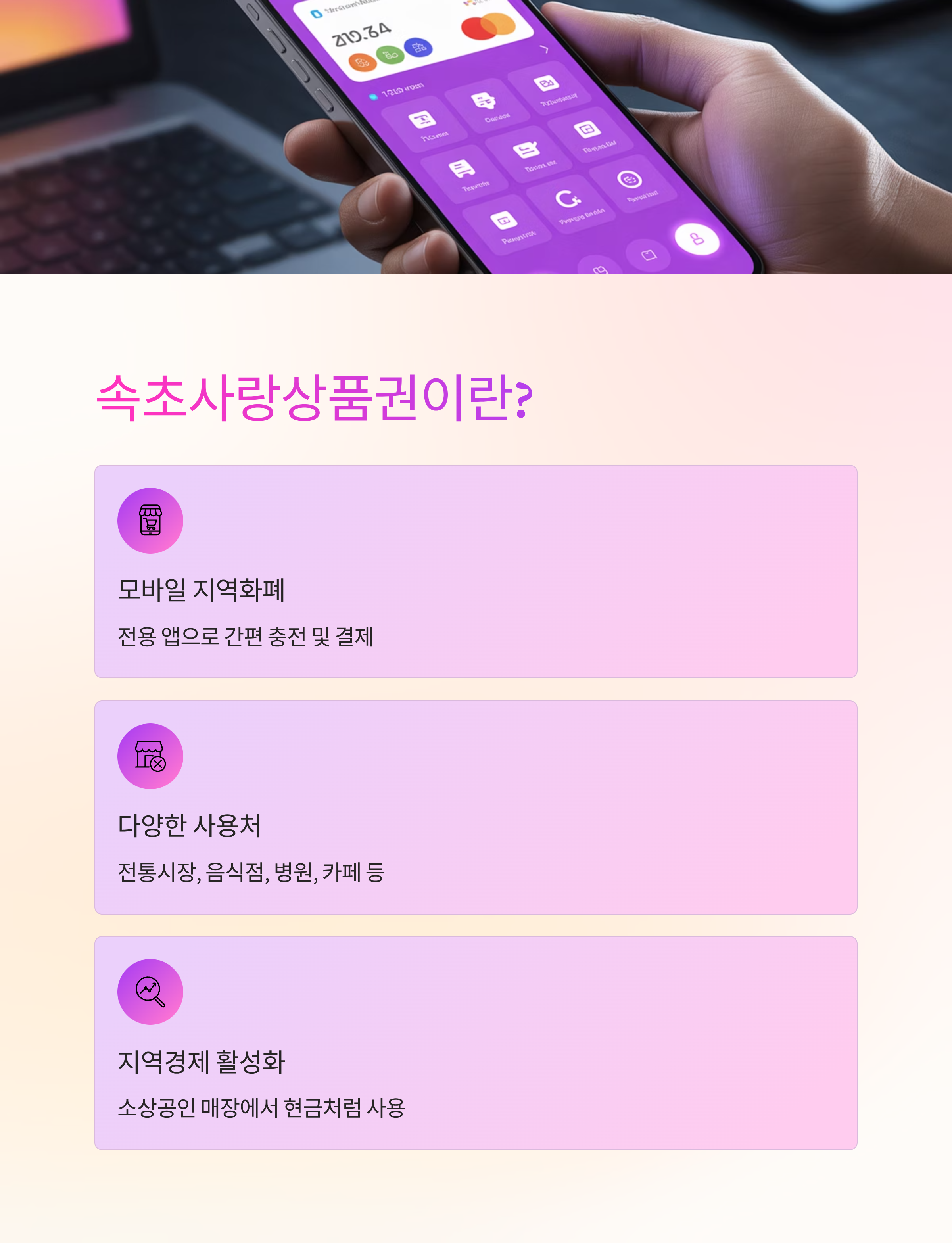 속초사랑상품권은 속초시가 발행하는 지역 화폐로, 지역 내 소상공인 매장에서 현금처럼 사용할 수 있습니다.
