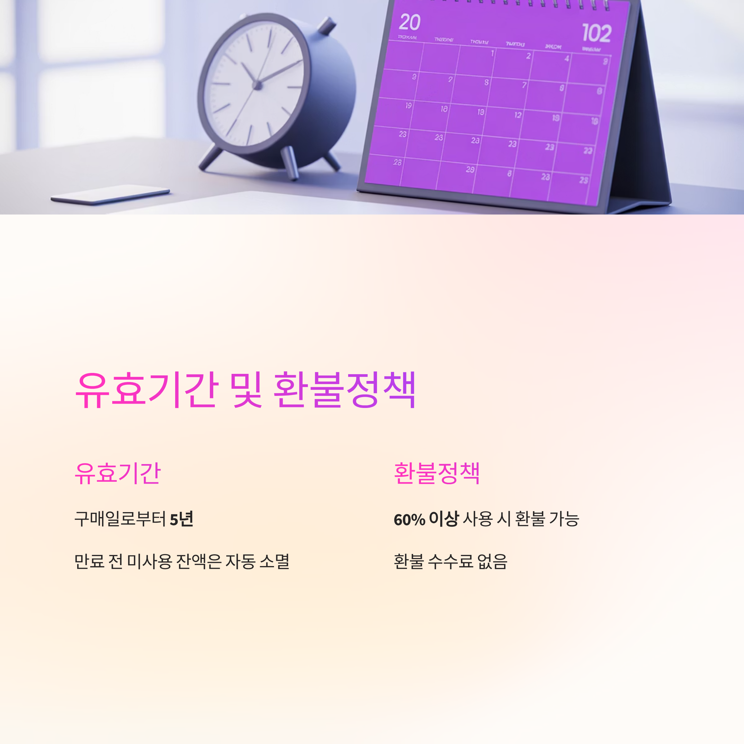 유효기간은 구매일로부터 5년이며, 만료 전까지 사용하지 않은 잔액은 자동 소멸됩니다.