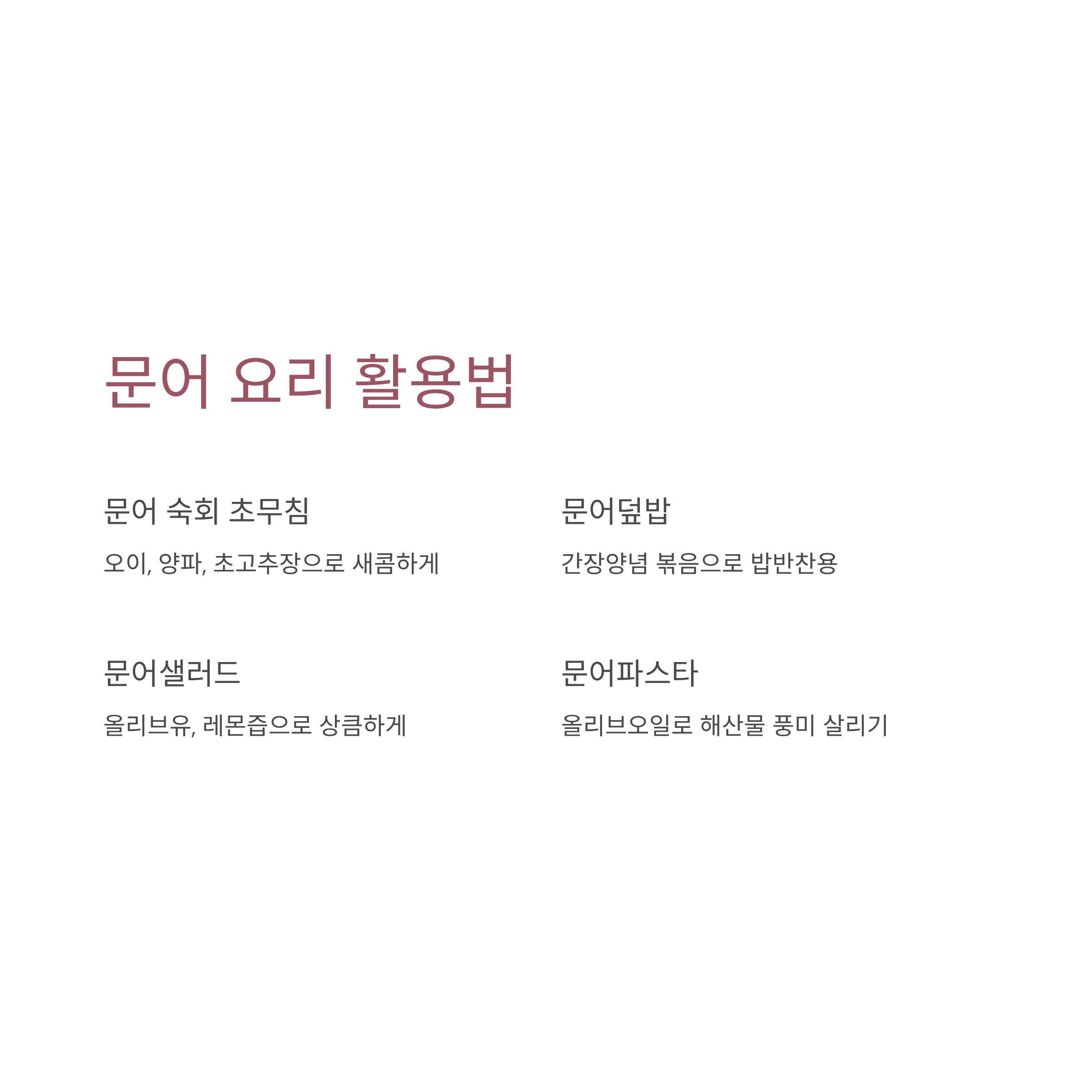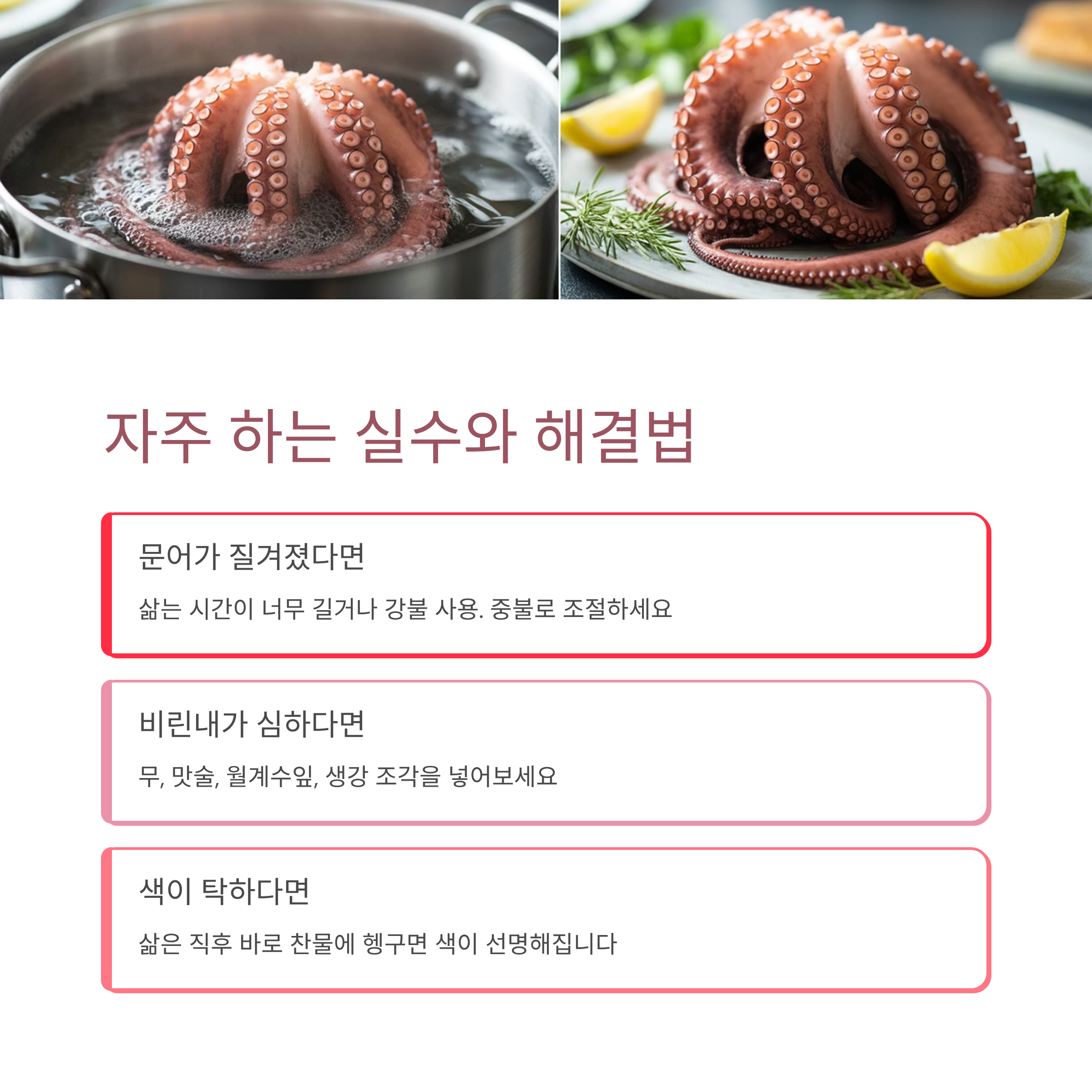 작은 문어는 짧게, 큰 문어는 천천히 익히고, 삶은 뒤에는 반드시 찬물에 담가 탱글한 식감을 완성하세요.