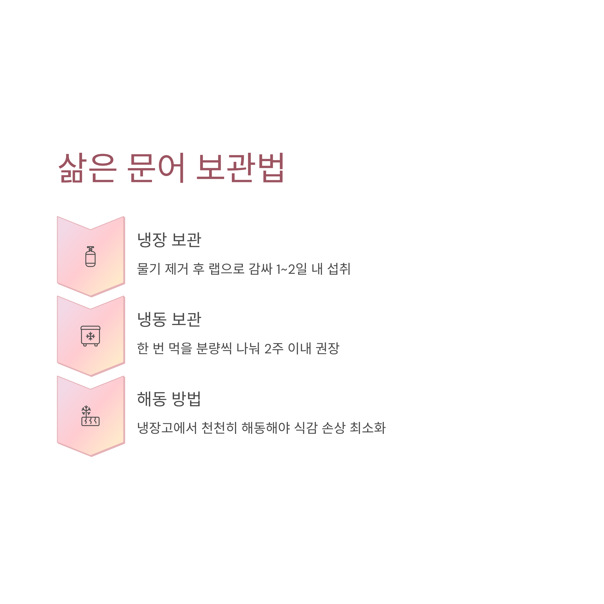 2. 장기 보관 시 한 번 먹을 분량씩 나눠 냉동 보관 (2주 이내 권장)