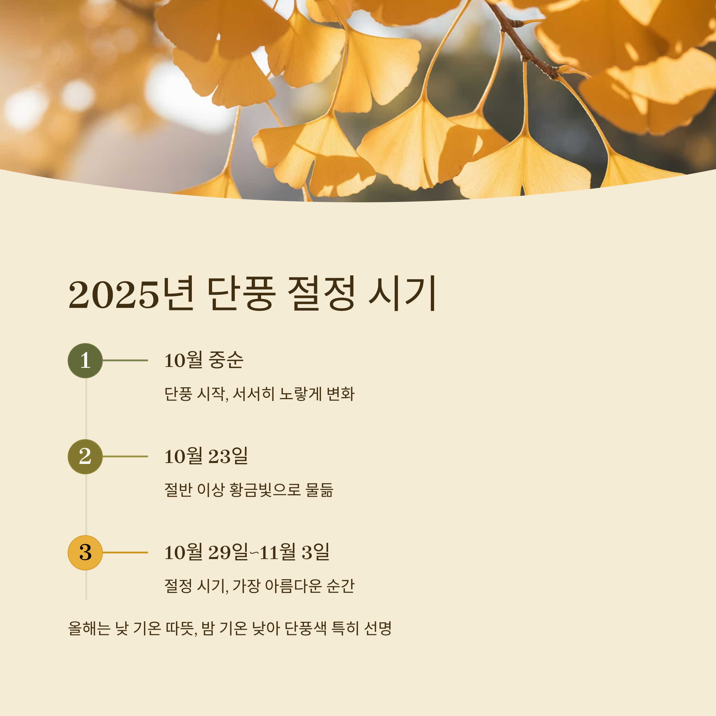 현재 10월 23일 기준으로 은행잎의 절반 이상이 노랗게 변했으며, 전체적인 절정 시기는 10월 29일부터 11월 3일 사이로 예상됩니다.