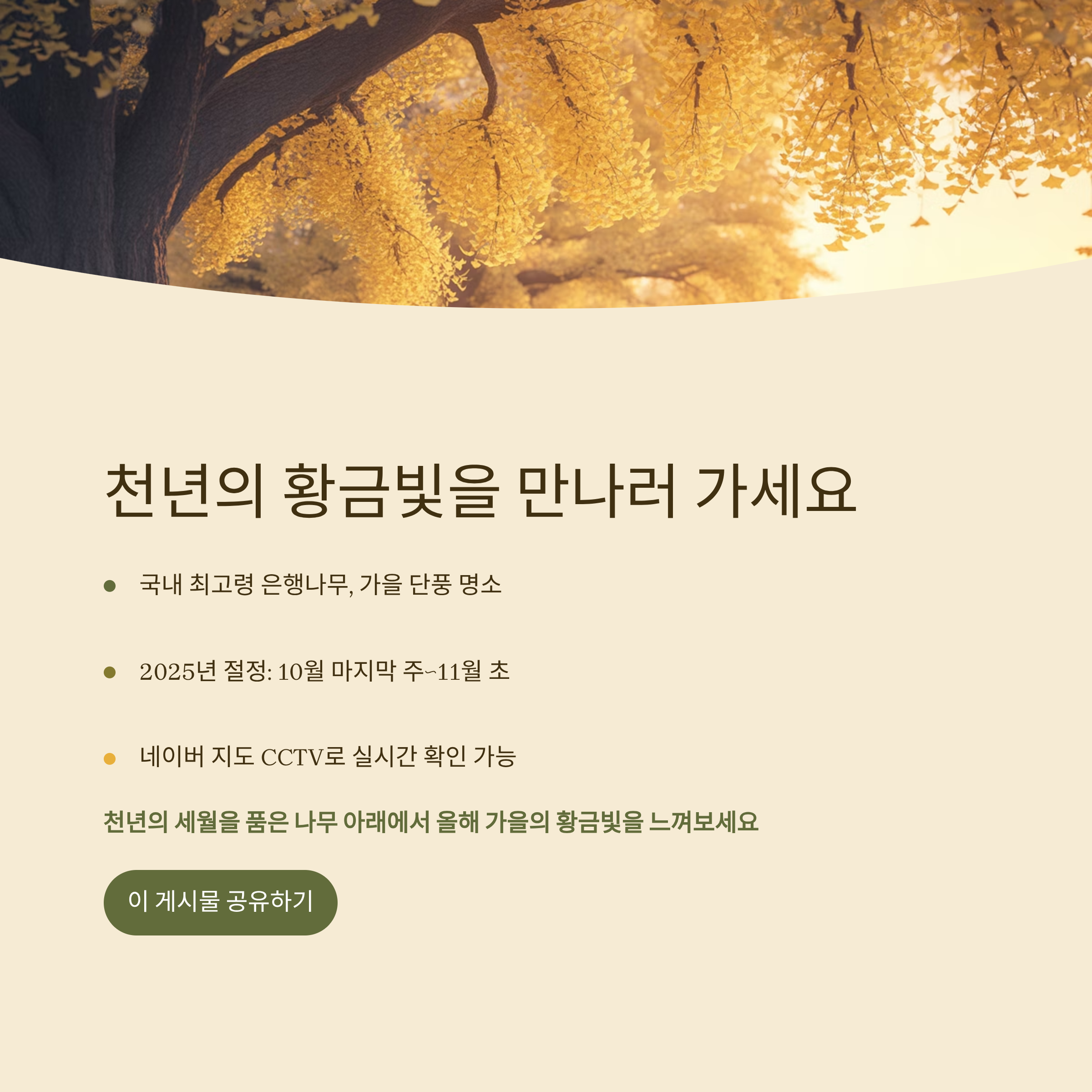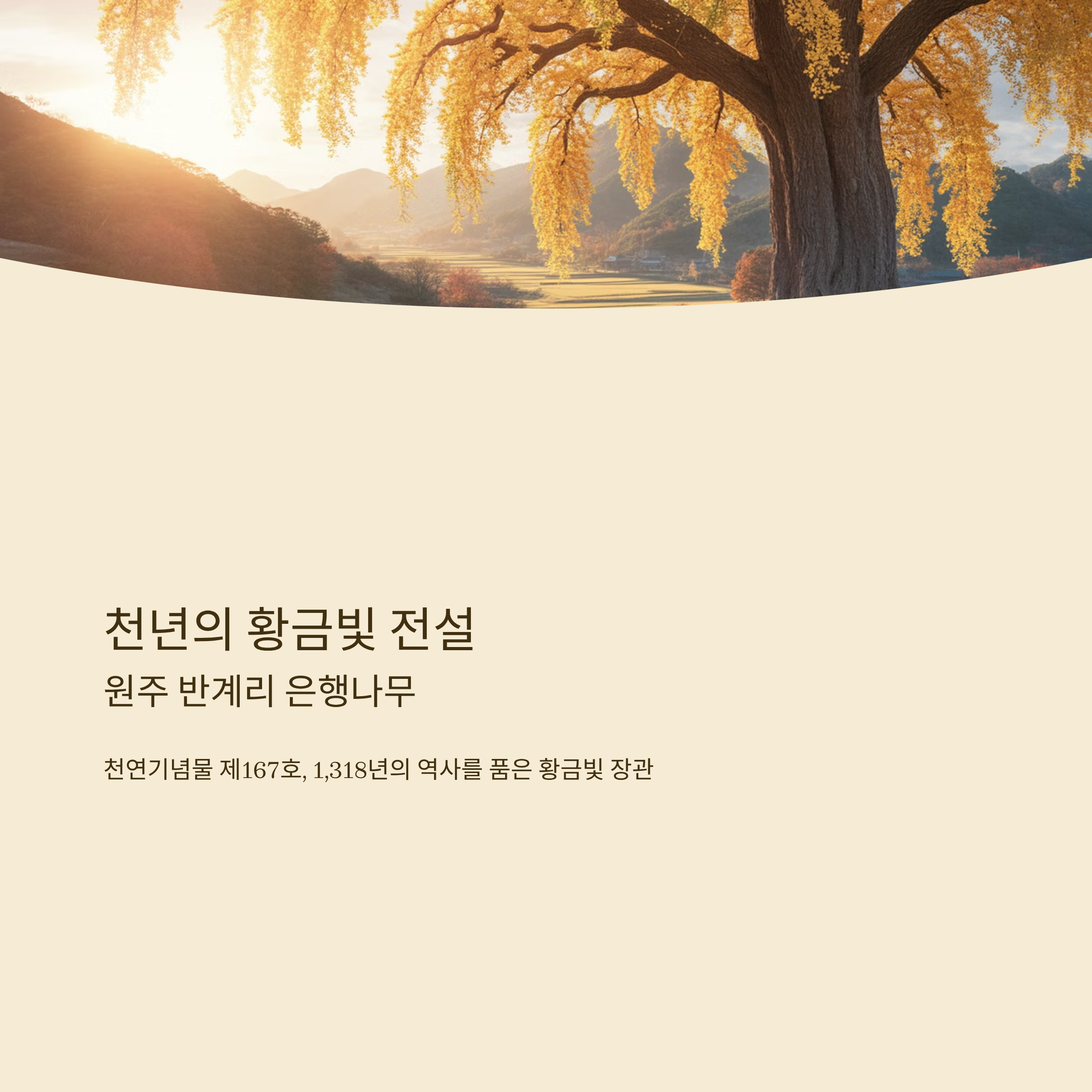 천년의 세월을 품은 나무 아래에서 올해 가을, 노란빛으로 물든 반계리의 아름다움을 직접 느껴보시기 바랍니다.