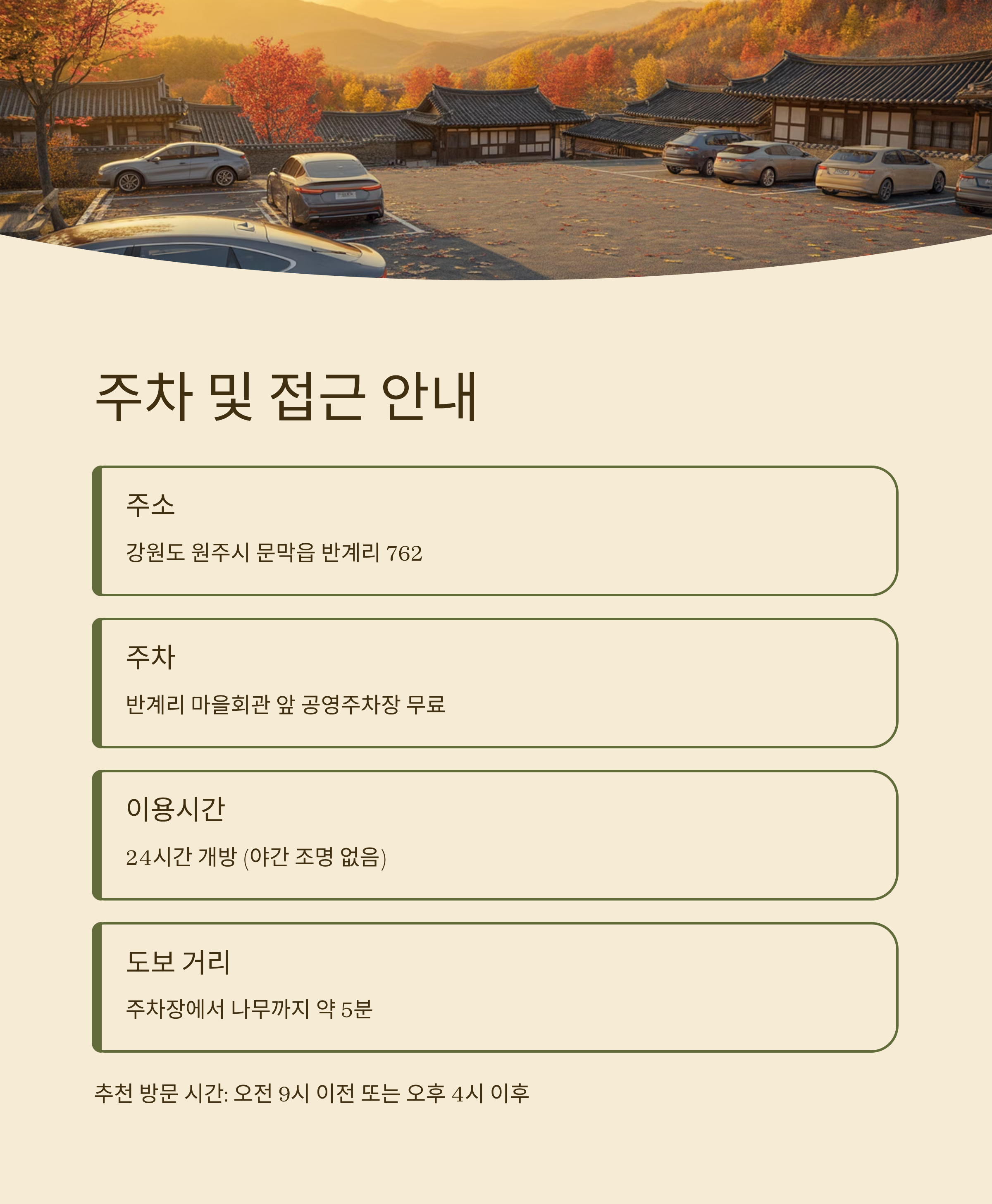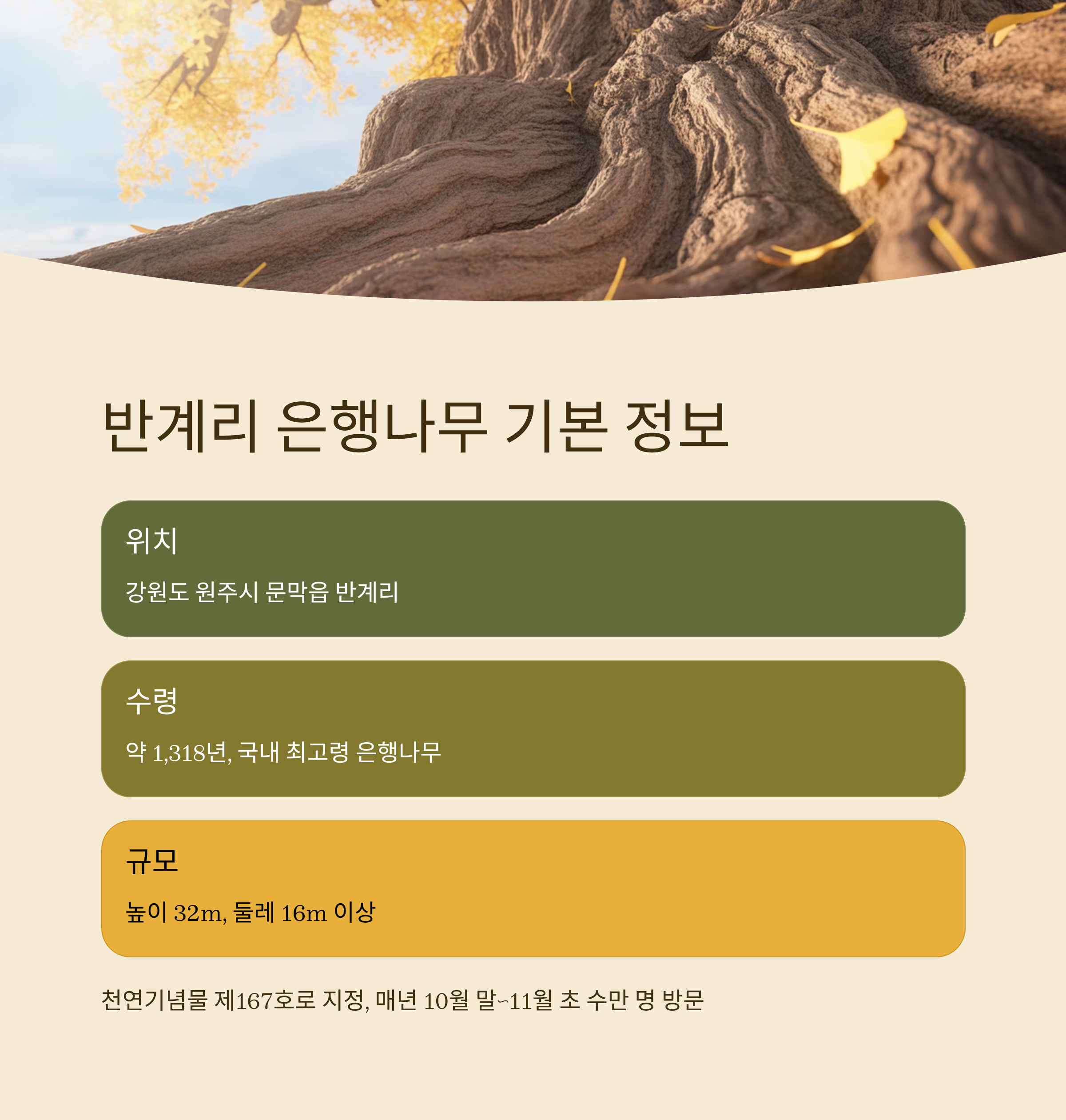 이처럼 반계리 은행나무는 원주 가을 여행의 핵심 코스로, 주변 관광지와 함께 하루 코스로 둘러보기 좋습니다.