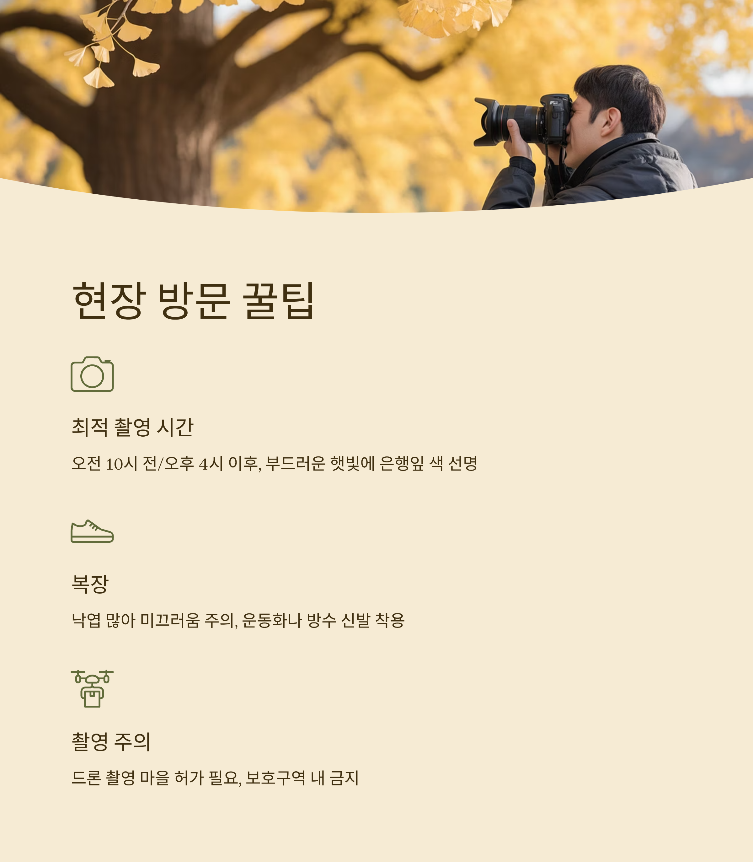 사진을 찍을 때는 나무 바로 아래보다 조금 떨어진 곳에서 전체 수형을 담으면 훨씬 웅장한 느낌을 표현할 수 있습니다.