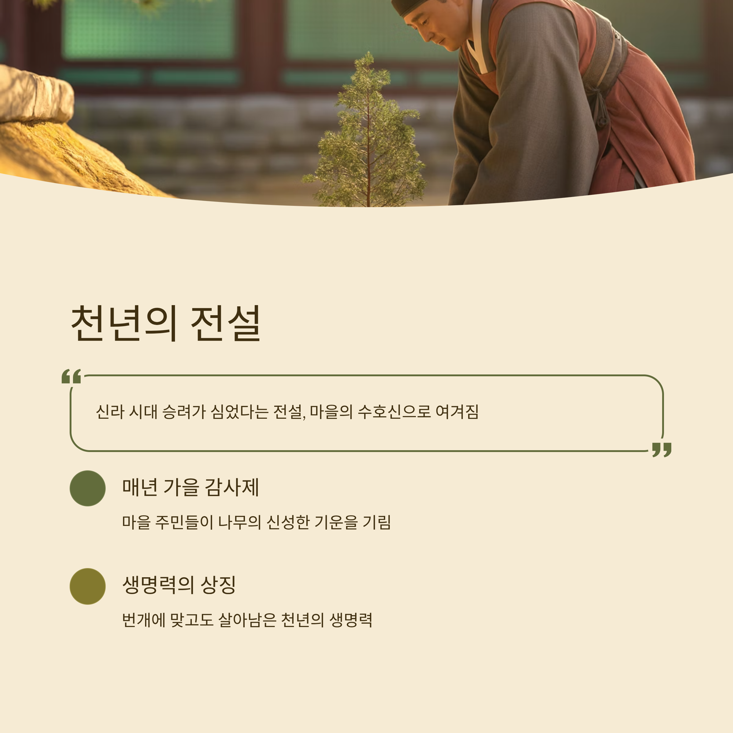 특히 이 나무는 한쪽 가지가 번개에 맞고도 여전히 살아남은 것으로 알려져, ‘천년을 버틴 생명력의 상징’으로 불립니다.