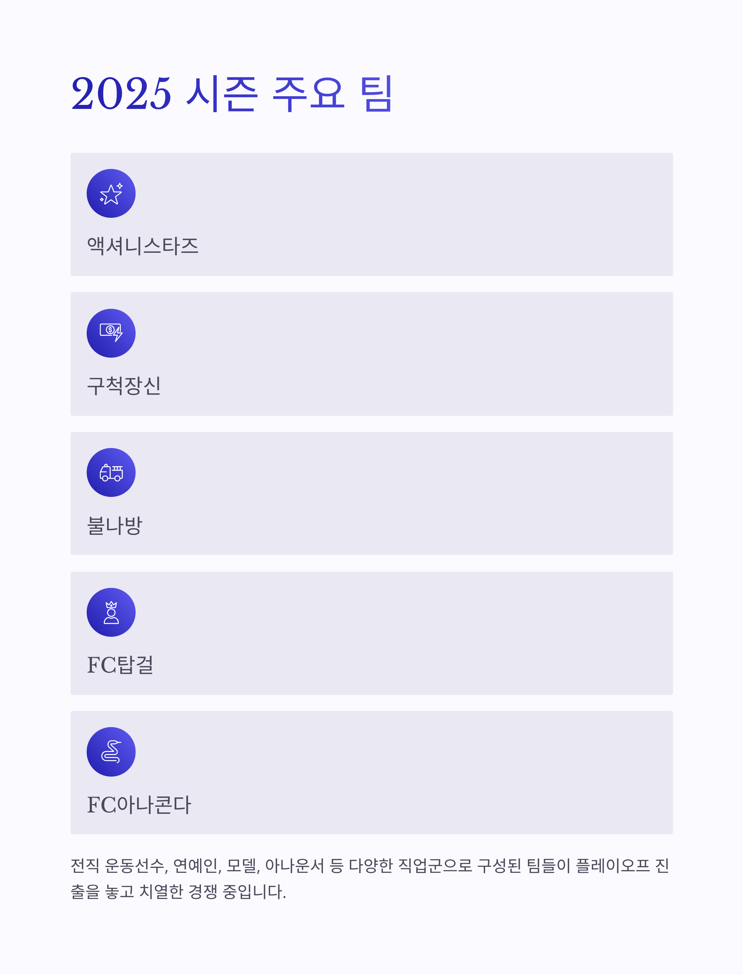 액셔니스타즈, 구척장신, 불나방, FC탑걸, FC아나콘다 등 기존 팀 외에도 신규 팀이 추가되었습니다.