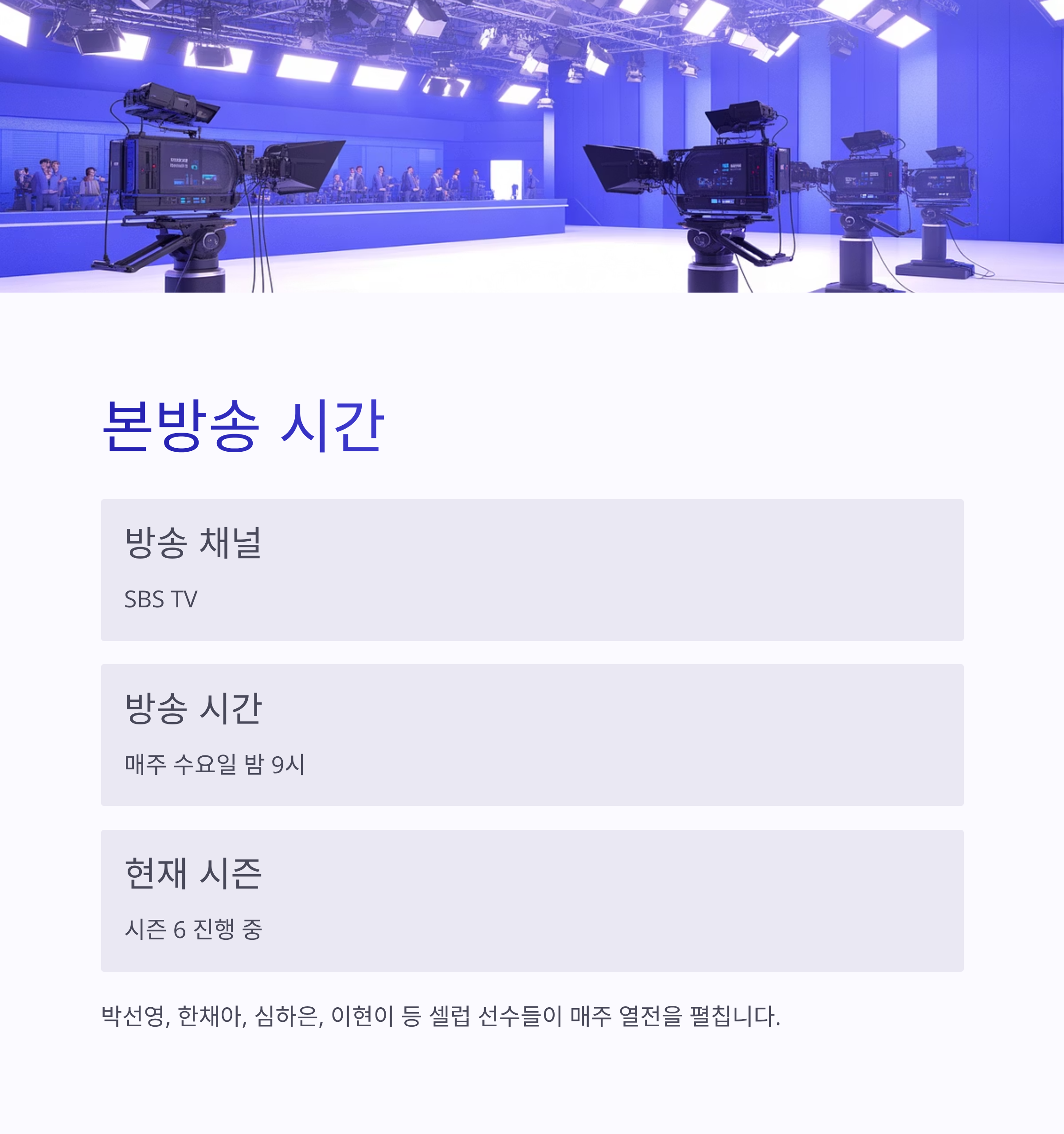 이처럼 예능과 스포츠가 결합된 새로운 포맷으로, 단순한 오락 프로그램을 넘어 스포츠 예능의 대표작으로 자리잡았습니다.