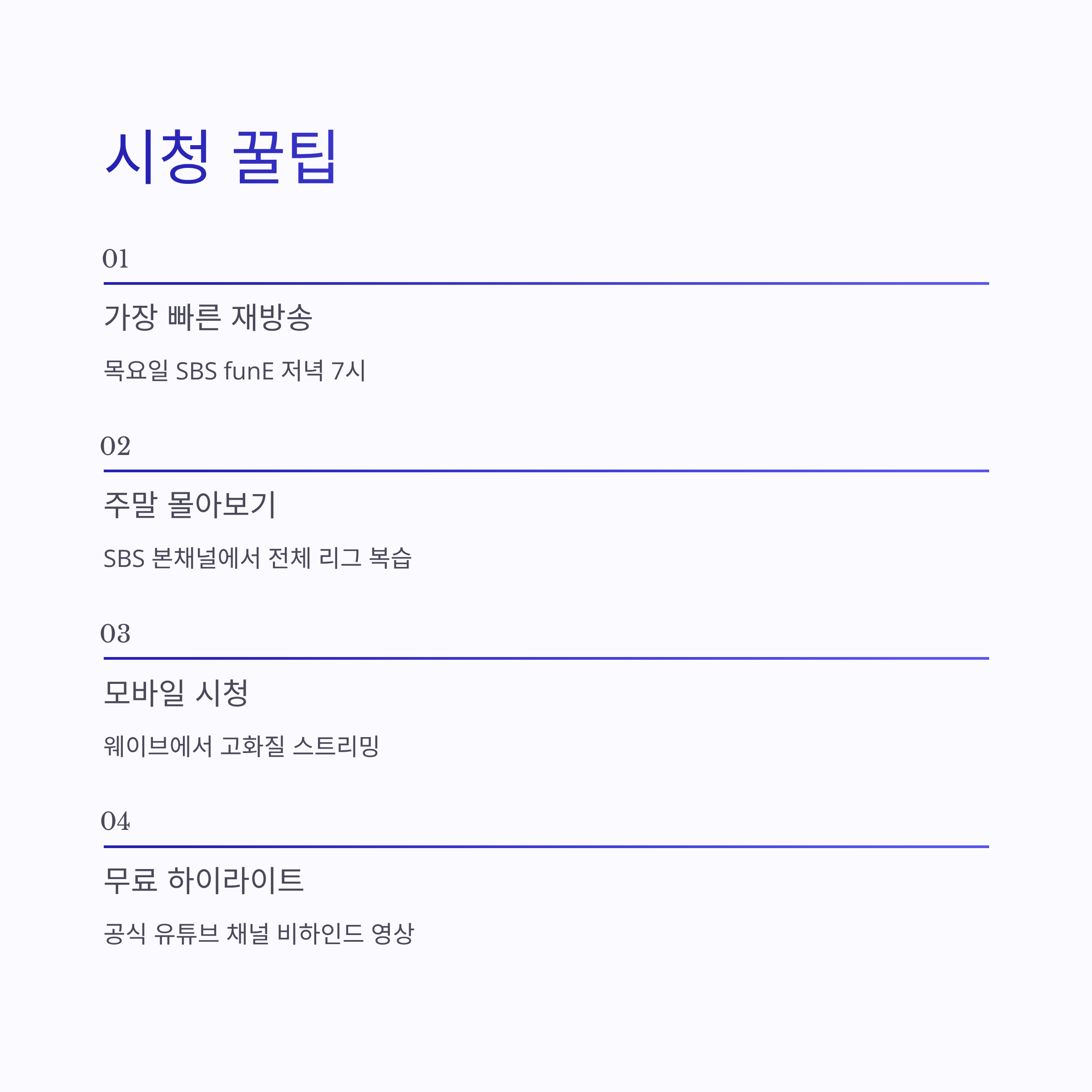 주말에는 SBS 본채널에서 몰아보기 편성으로 전체 리그를 복습할 수 있습니다.