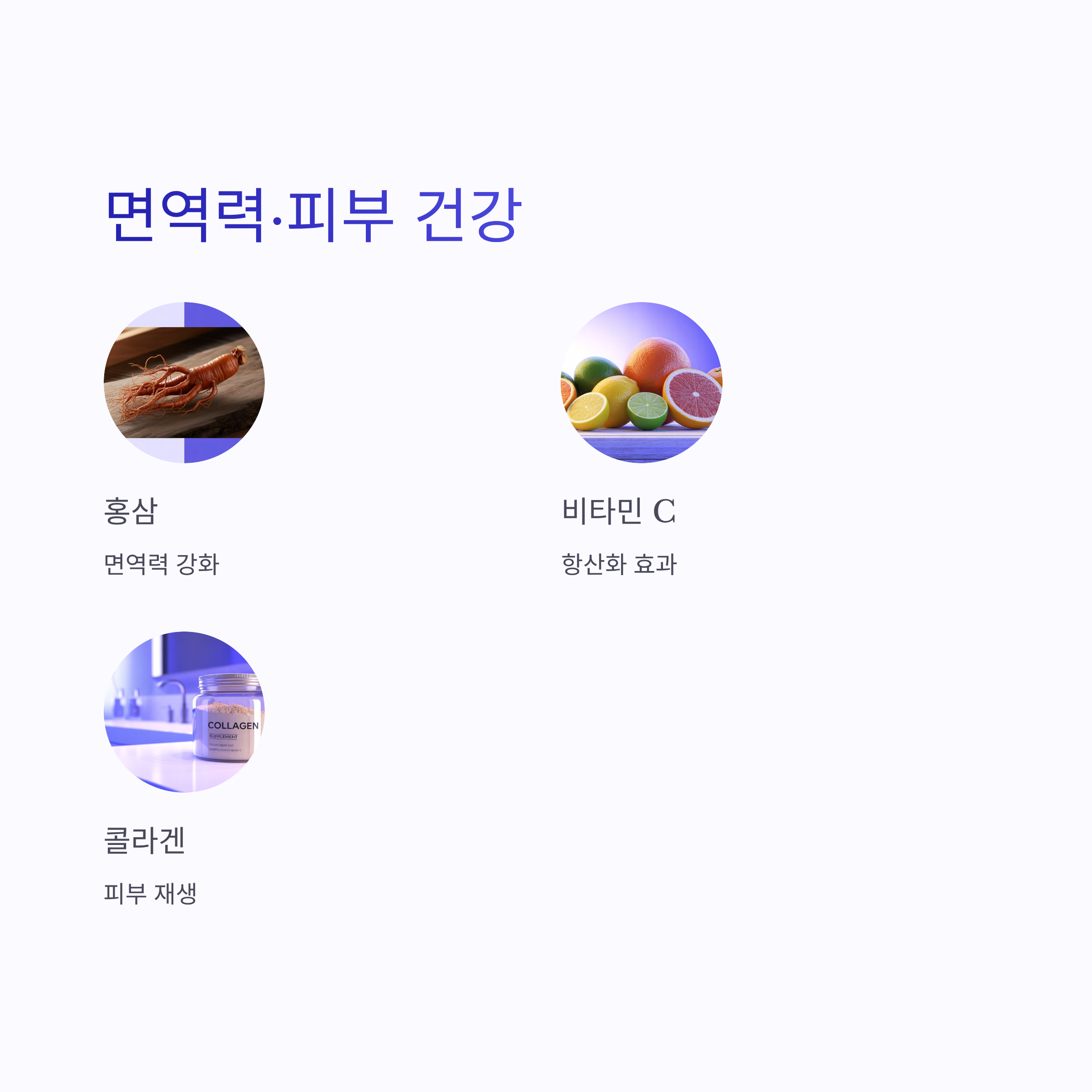 홍삼, 비타민 C, 콜라겐, 셀레늄 등의 성분이 피부 재생과 면역력 강화에 도움을 줍니다.