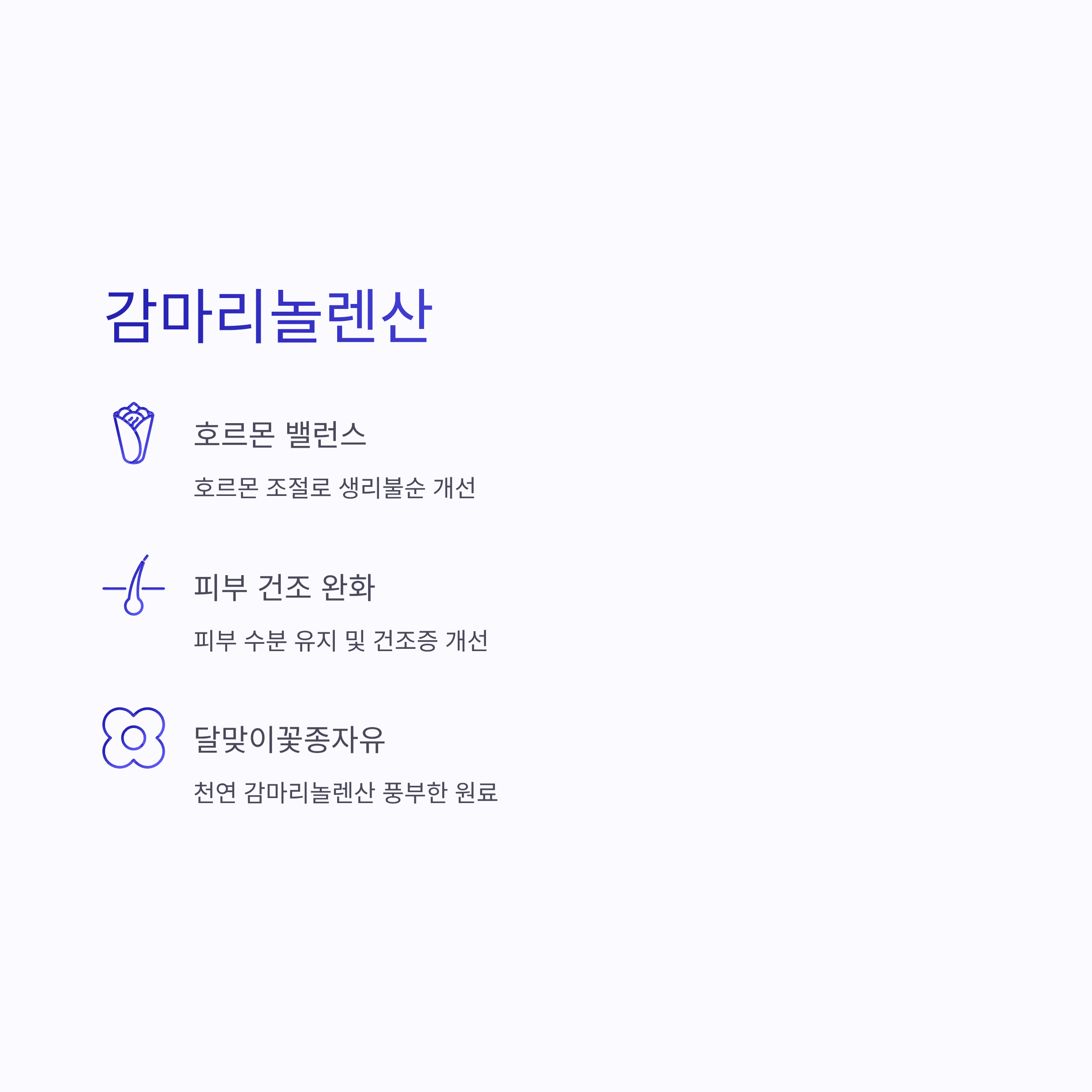 감마리놀렌산은 호르몬 밸런스 조절에 도움이 되며, 생리불순이나 피부 건조증, 염증 완화에도 효과적입니다.