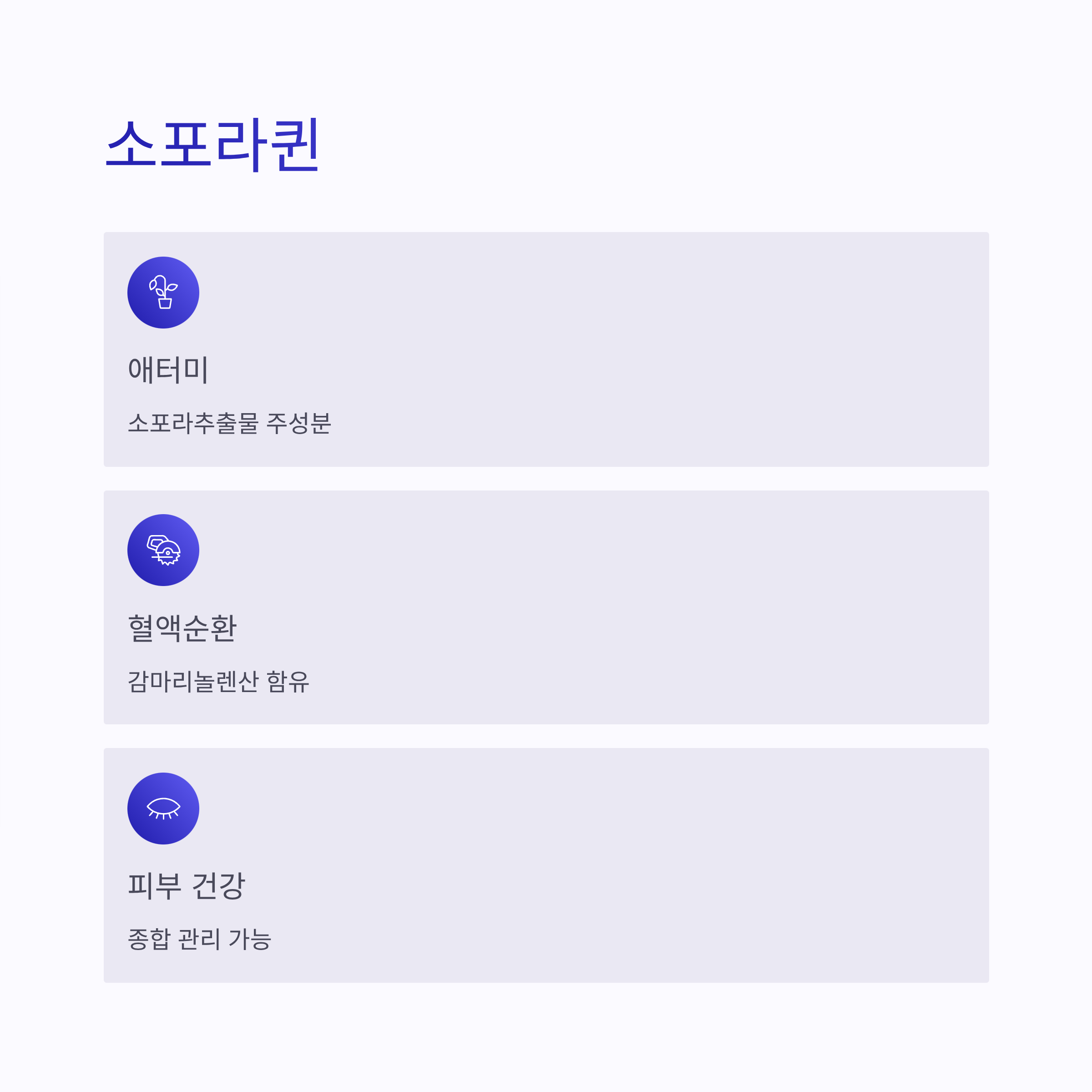 소포라추출물과 감마리놀렌산을 주성분으로 하여 혈액순환과 피부 건강을 함께 관리할 수 있습니다.