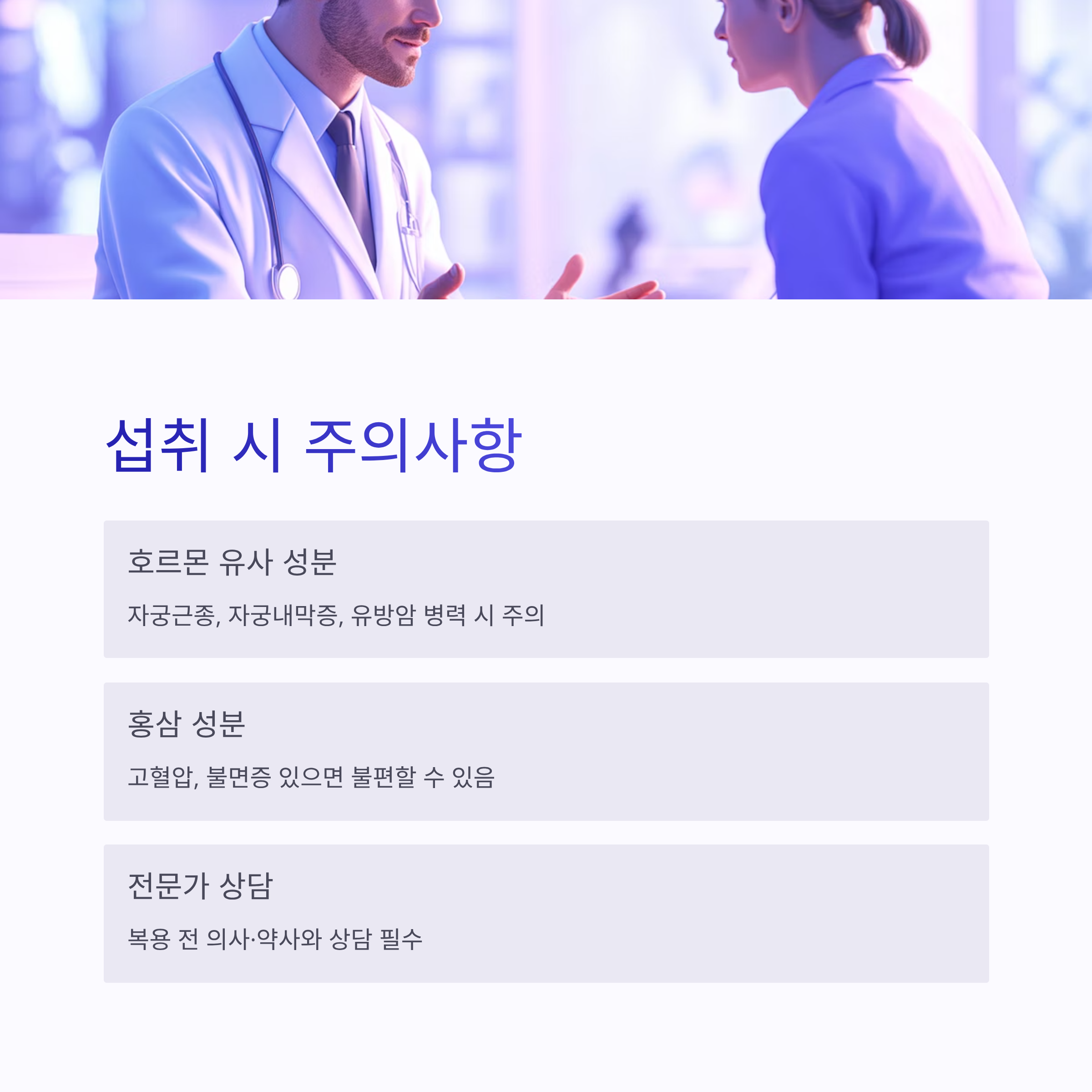 호르몬 유사 성분이 들어 있는 제품은 자궁근종, 자궁내막증, 유방암 병력이 있는 사람에게는 부작용을 일으킬 수 있습니다.