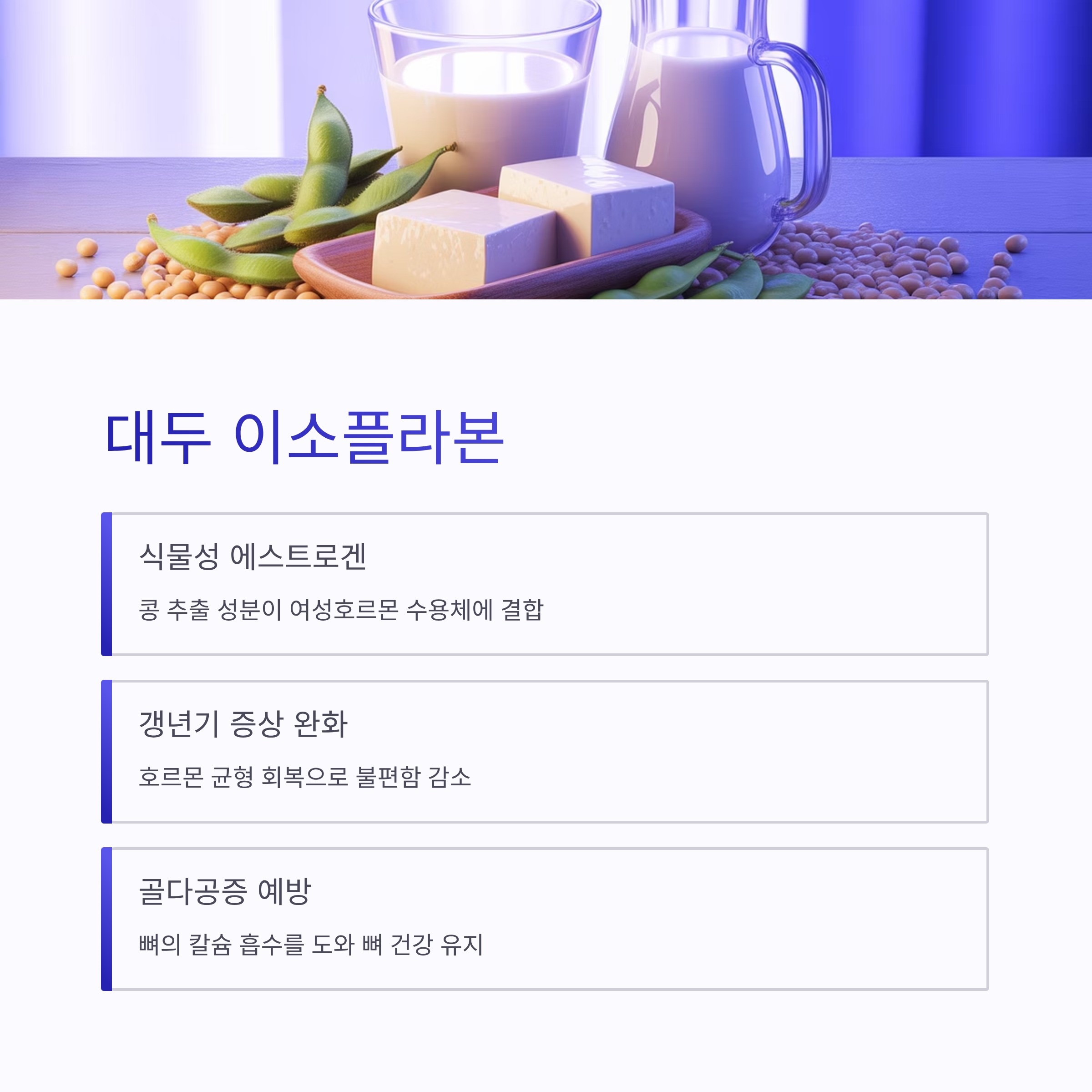 콩에서 추출한 이소플라본은 대표적인 식물성 에스트로겐으로, 여성호르몬 수용체에 결합하여 갱년기 증상을 완화합니다.