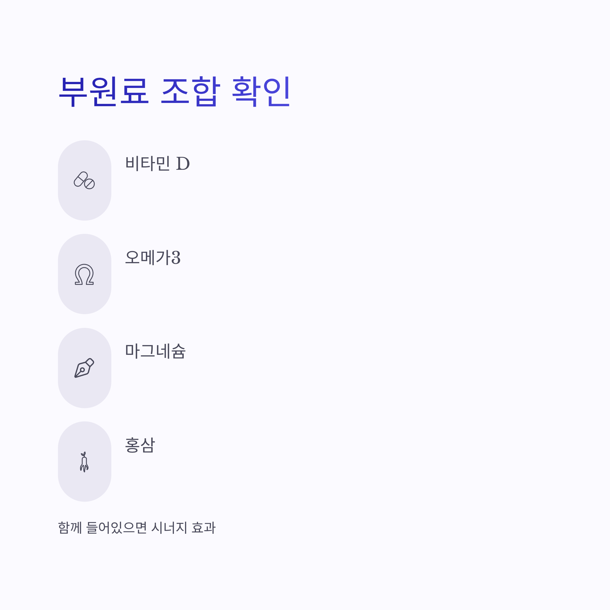 비타민 D, 오메가3, 마그네슘, 홍삼 등이 함께 들어 있으면 시너지 효과를 얻을 수 있습니다.