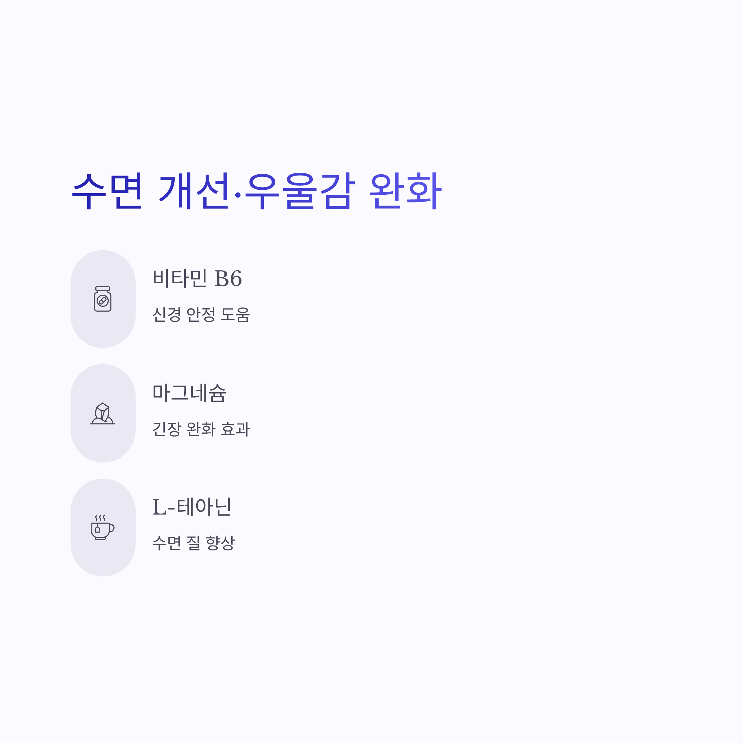 비타민 B6, 마그네슘, L-테아닌 등이 신경 안정에 도움을 주며 수면의 질을 높입니다.