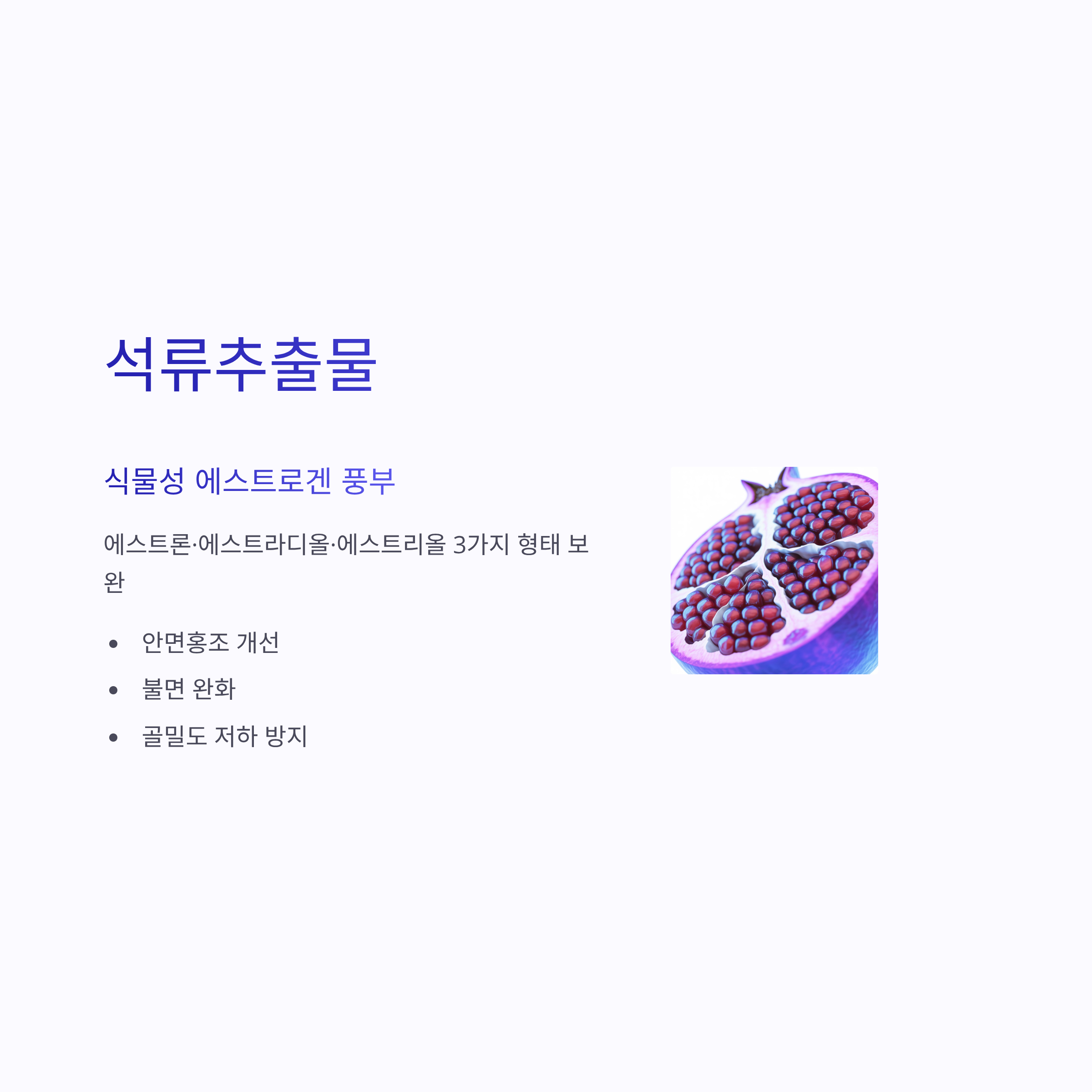 석류에는 식물성 에스트로겐이 풍부하게 함유되어 있으며, 에스트론·에스트라디올·에스트리올 3가지 형태의 에스트로겐 작용을 보완합니다.