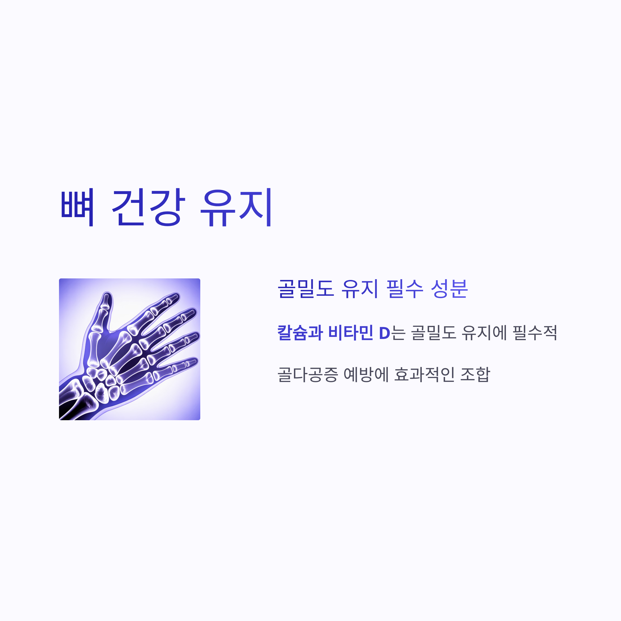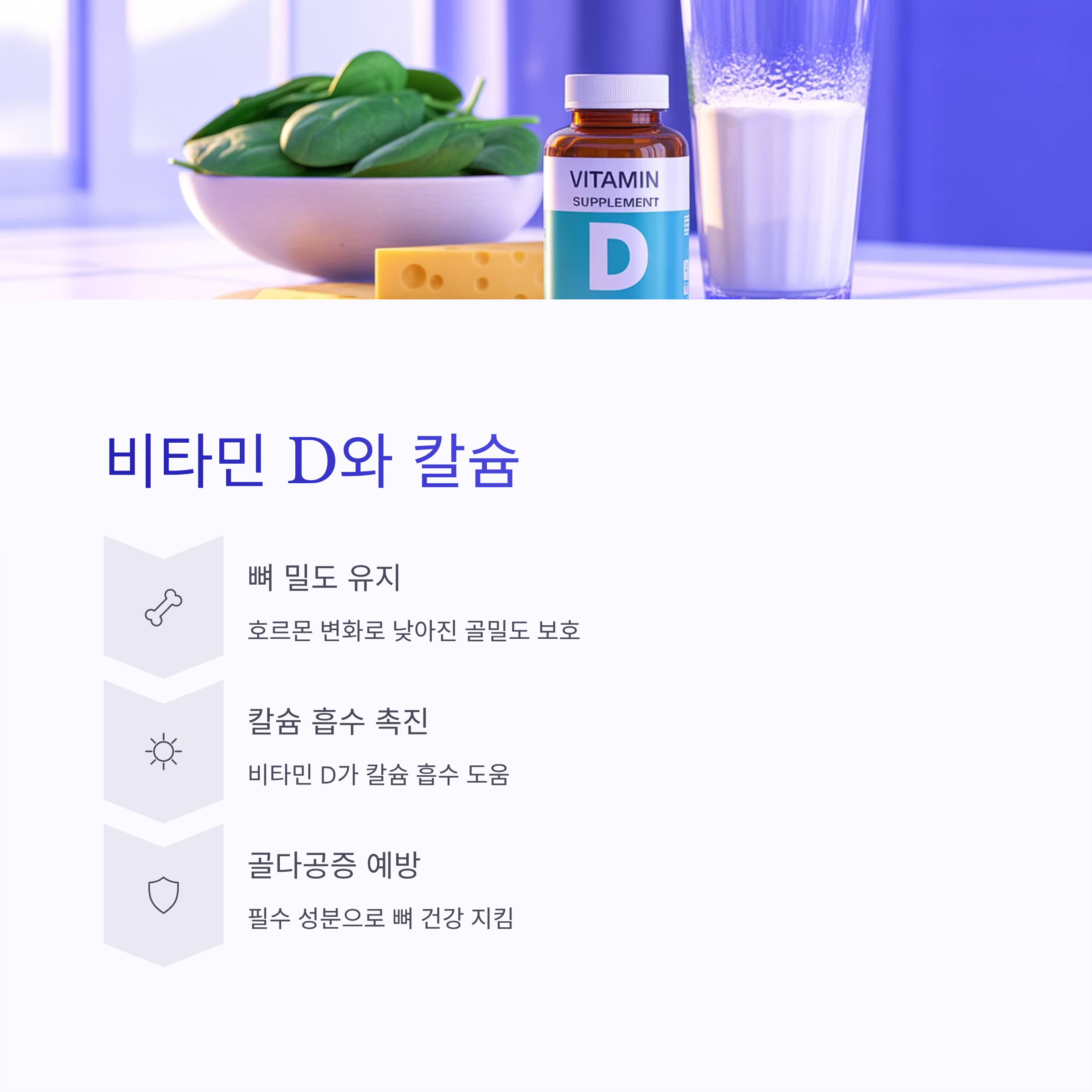 칼슘과 비타민 D는 골밀도 유지에 필수적이며, 골다공증 예방에 효과적입니다.