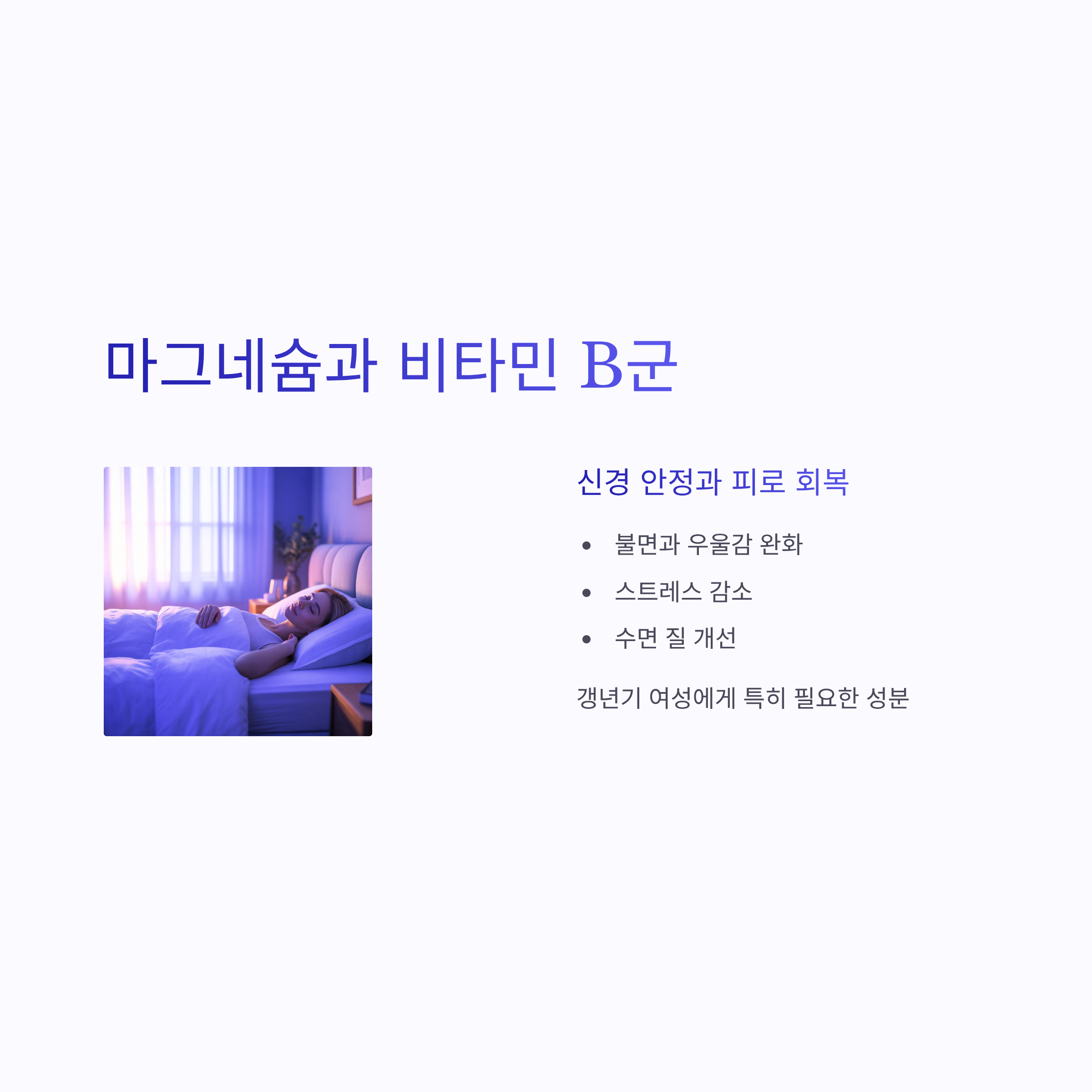 신경 안정과 피로 회복에 도움을 주며, 불면과 우울감이 있는 갱년기 여성에게 특히 필요합니다.