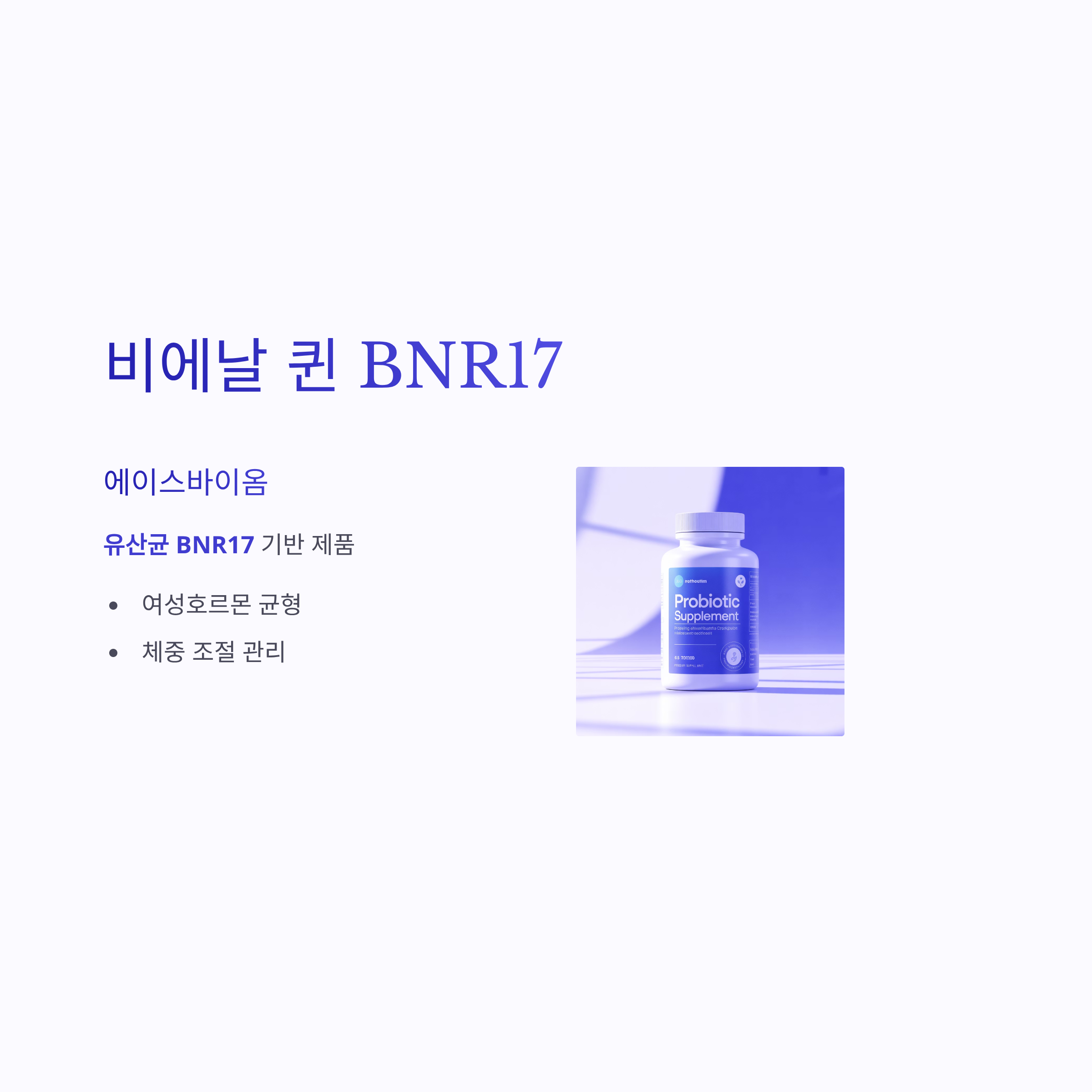 유산균 BNR17을 기반으로 여성호르몬 균형 및 체중 조절을 함께 관리할 수 있습니다.