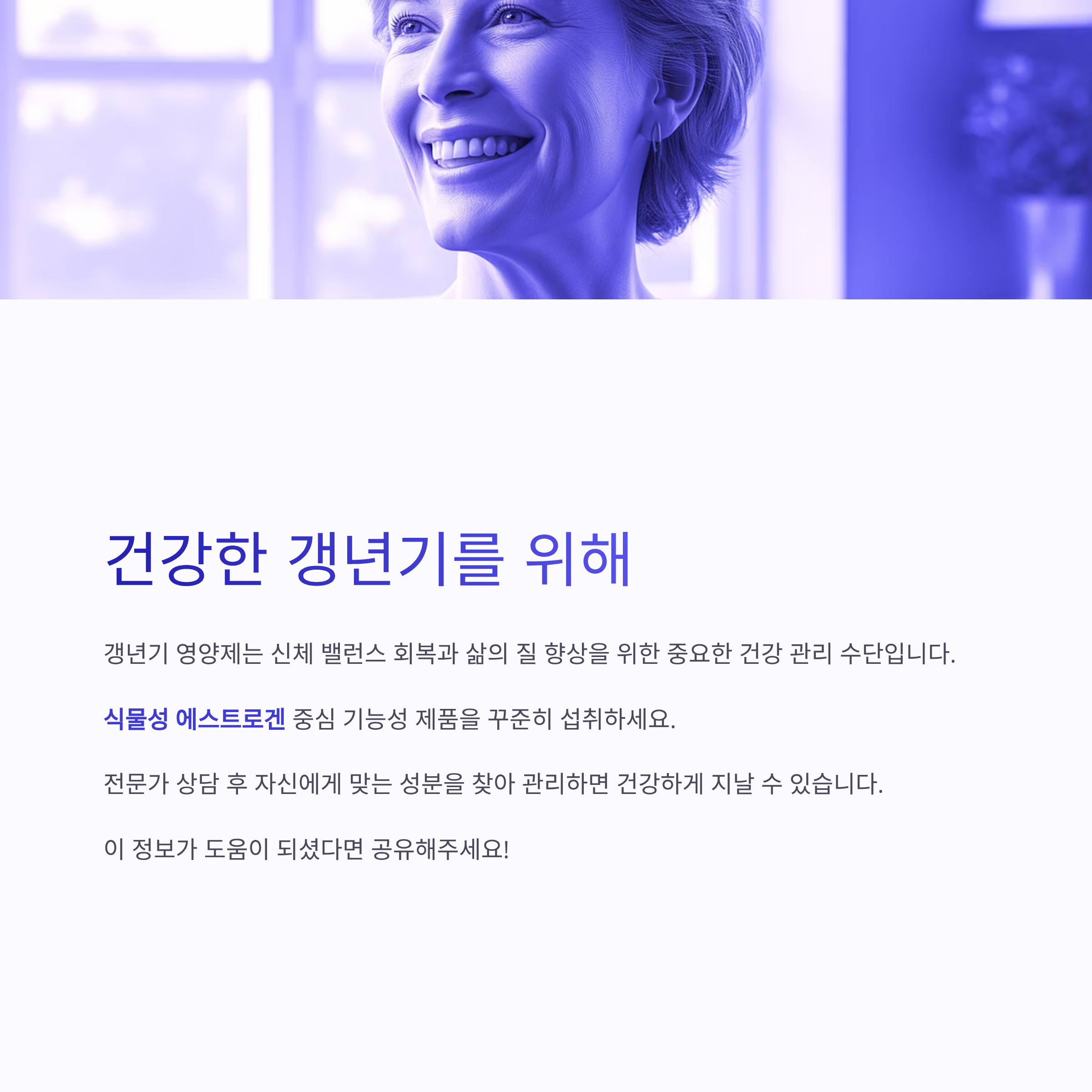 자신에게 맞는 성분을 찾아 꾸준히 관리한다면, 갱년기도 건강하게 지나갈 수 있습니다.