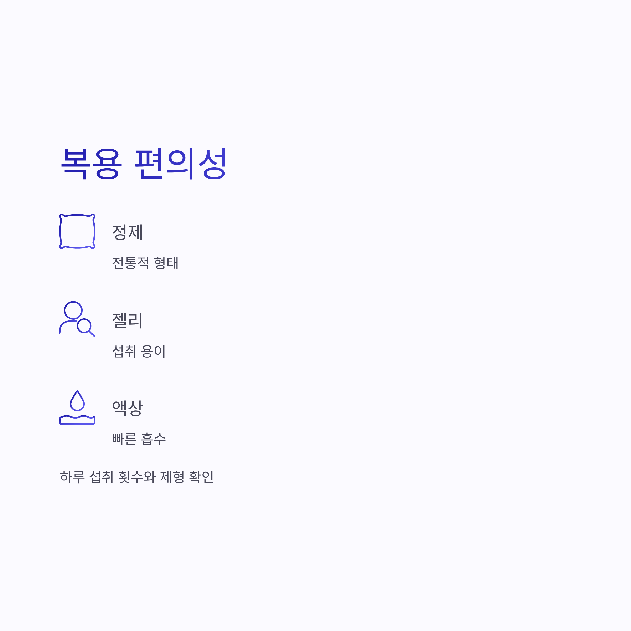 하루 섭취 횟수와 제형(정제, 젤리, 액상 등)을 확인하고 자신에게 맞는 형태를 선택합니다.