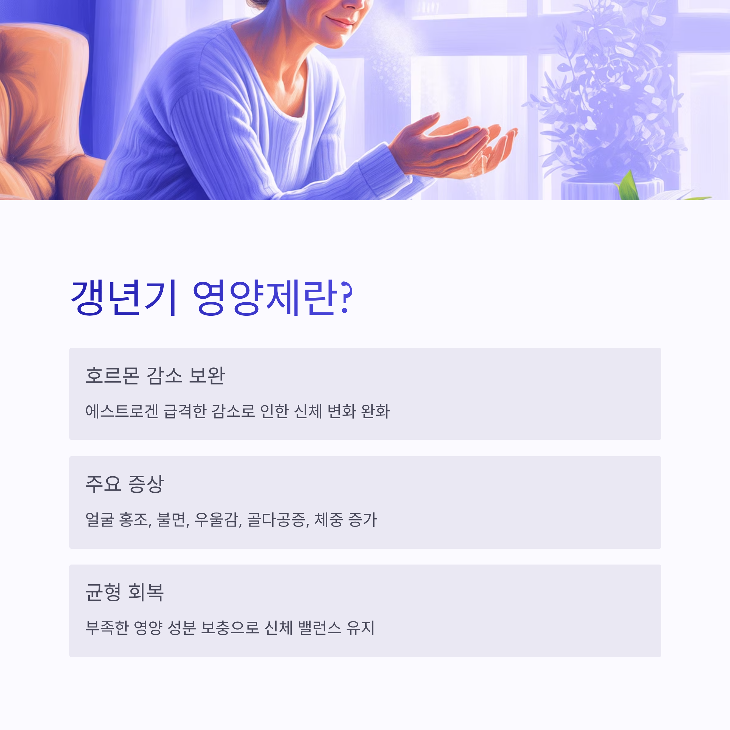 갱년기 영양제는 단순한 보조제가 아니라, 신체 밸런스를 회복하고 삶의 질을 향상시키는 중요한 건강 관리 수단입니다.