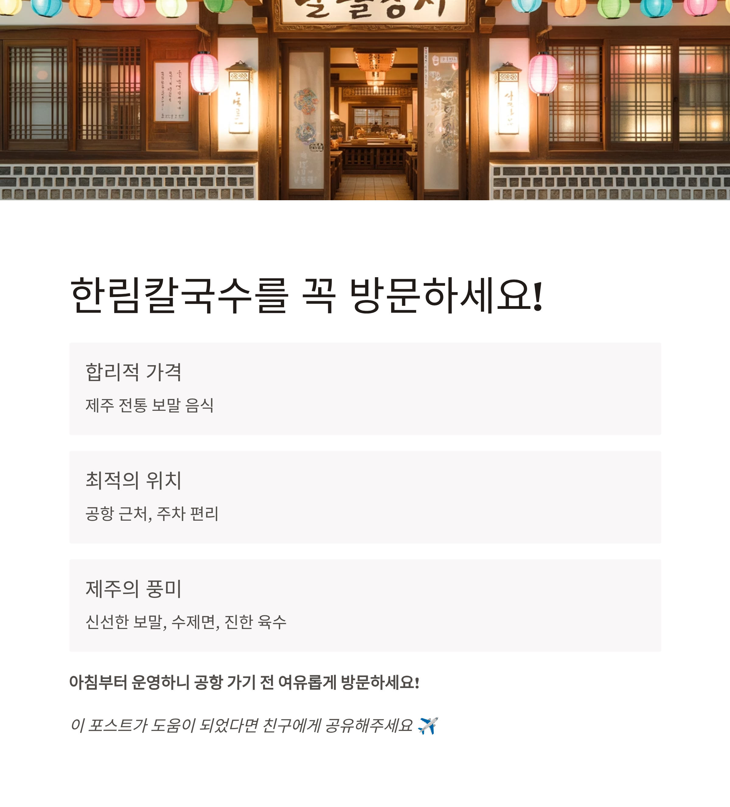 제주공항 근처에서 현지 음식을 맛보고 싶다면 반드시 들러야 할 곳이 바로 한림칼국수 제주공항점이다. 제주를 대표하는 향토 음식 중 하나인 보말칼국수를 전문으로 하며, 신선한 재료와 깊은 육수 맛으로 현지인과 관광객 모두에게 큰 사랑을 받고 있다. 이번 글에서는 한림칼국수 제주공항점의 위치, 영업시간, 대표 메뉴, 매장 분위기, 그리고 실제 방문자들의 평가까지 종합적으로 정리했다.