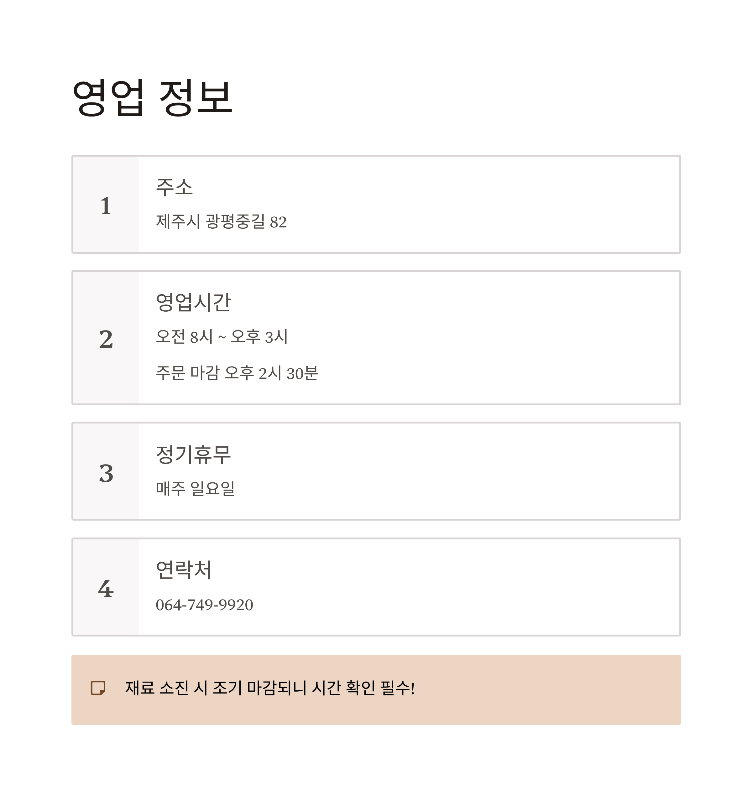 영업시간은 아침 일찍부터 시작되기 때문에 제주 도착 직후 아침 식사 장소로도 인기가 높다. 점심시간 이후에는 재료 소진으로 조기 마감되는 경우도 있으니 방문 시 시간을 잘 맞추는 것이 좋다.