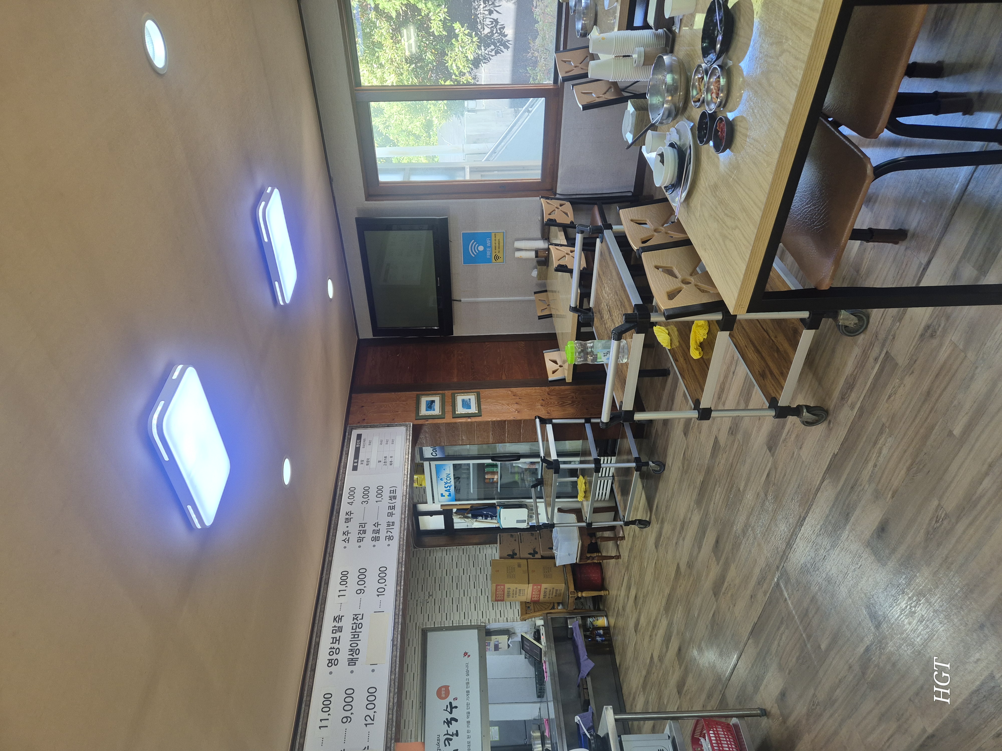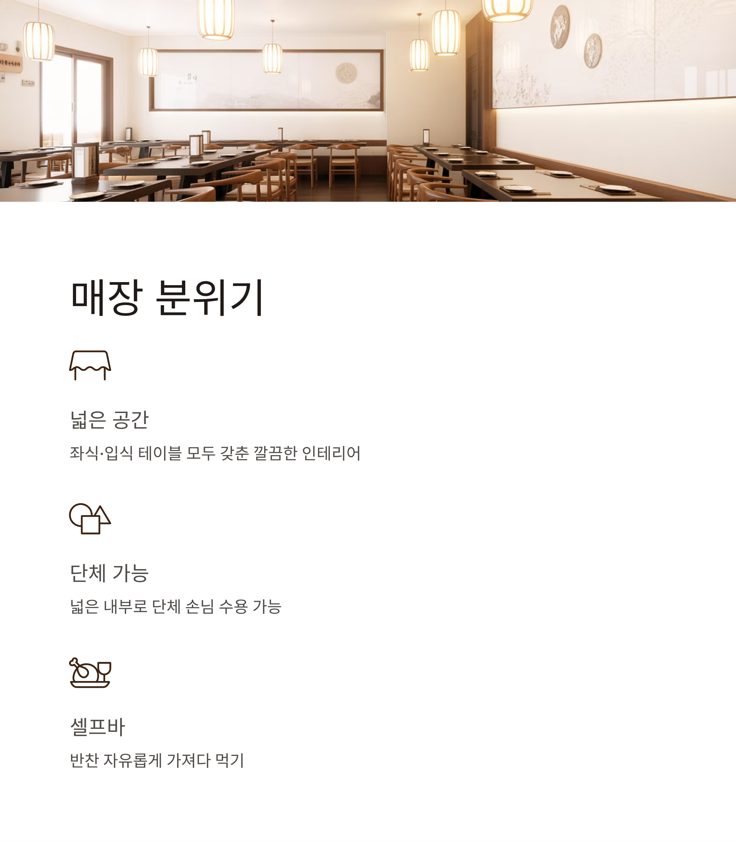 내부 공간이 넓어 단체 손님도 수용 가능하며, 반찬은 셀프바에서 자유롭게 가져다 먹을 수 있다.