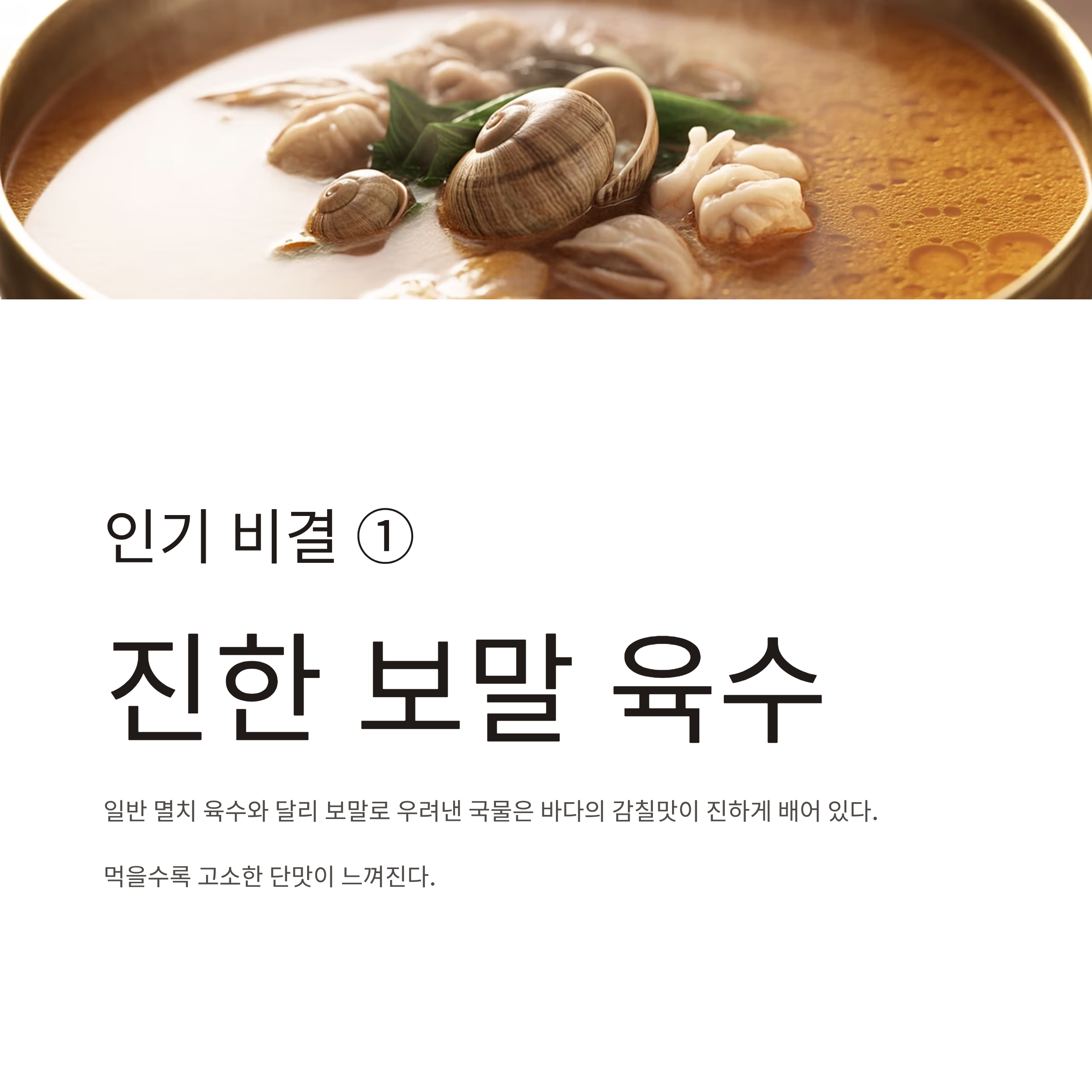 일반 멸치 육수와 달리 보말로 우려낸 국물은 바다의 감칠맛이 진하게 배어 있으며, 먹을수록 고소한 단맛이 느껴진다.
