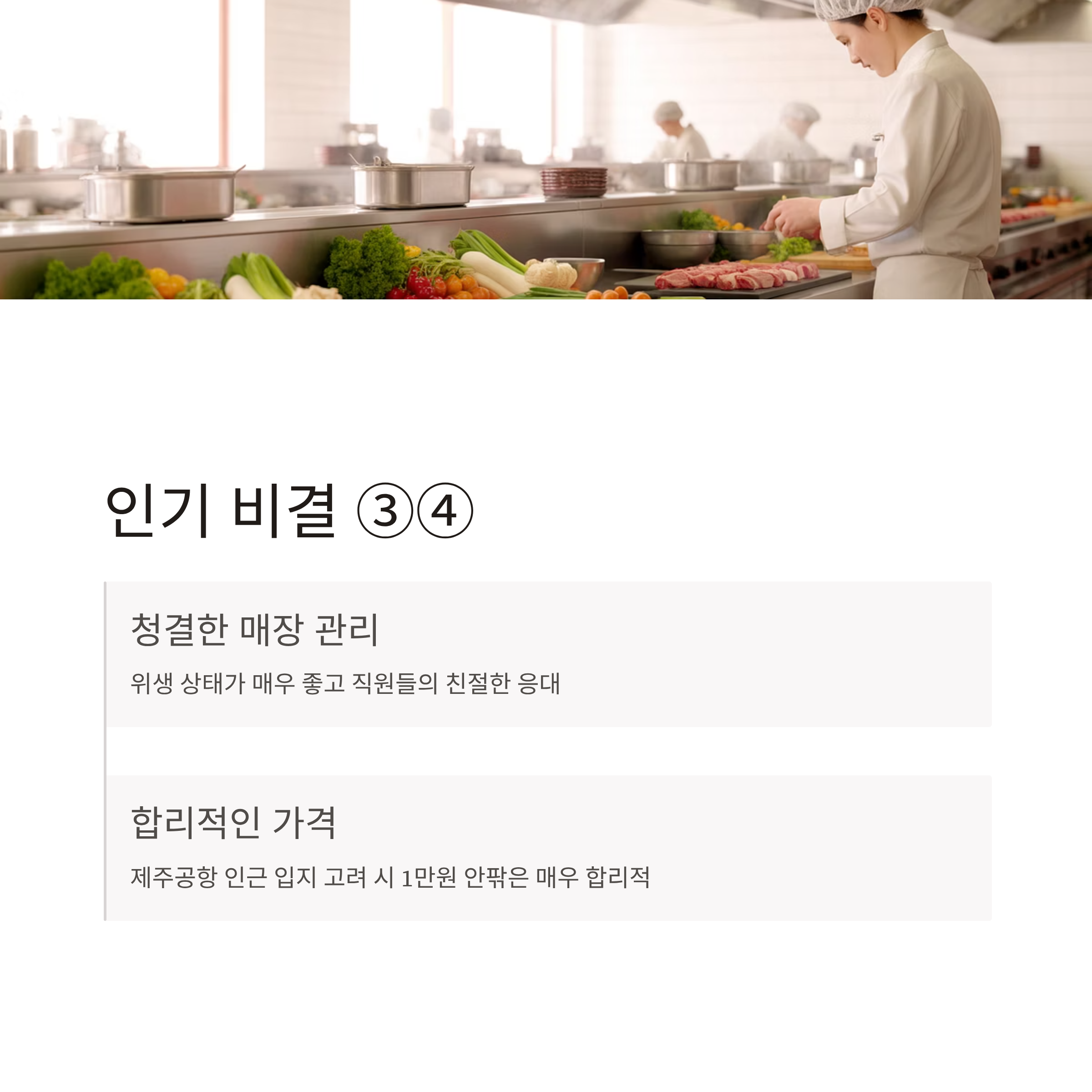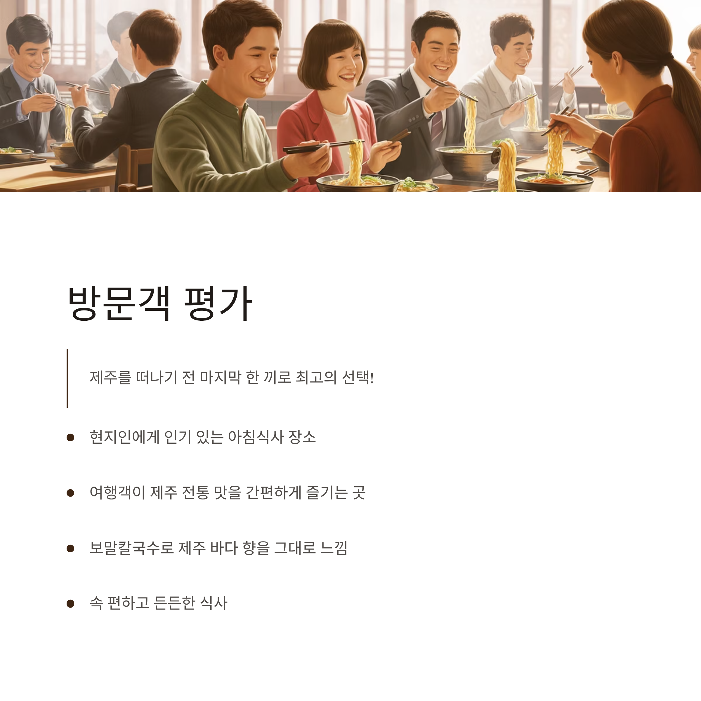 현지인에게도 아침식사 장소로 인기가 많으며, 여행객에게는 제주 전통의 맛을 간편하게 즐길 수 있는 최적의 식당이다.