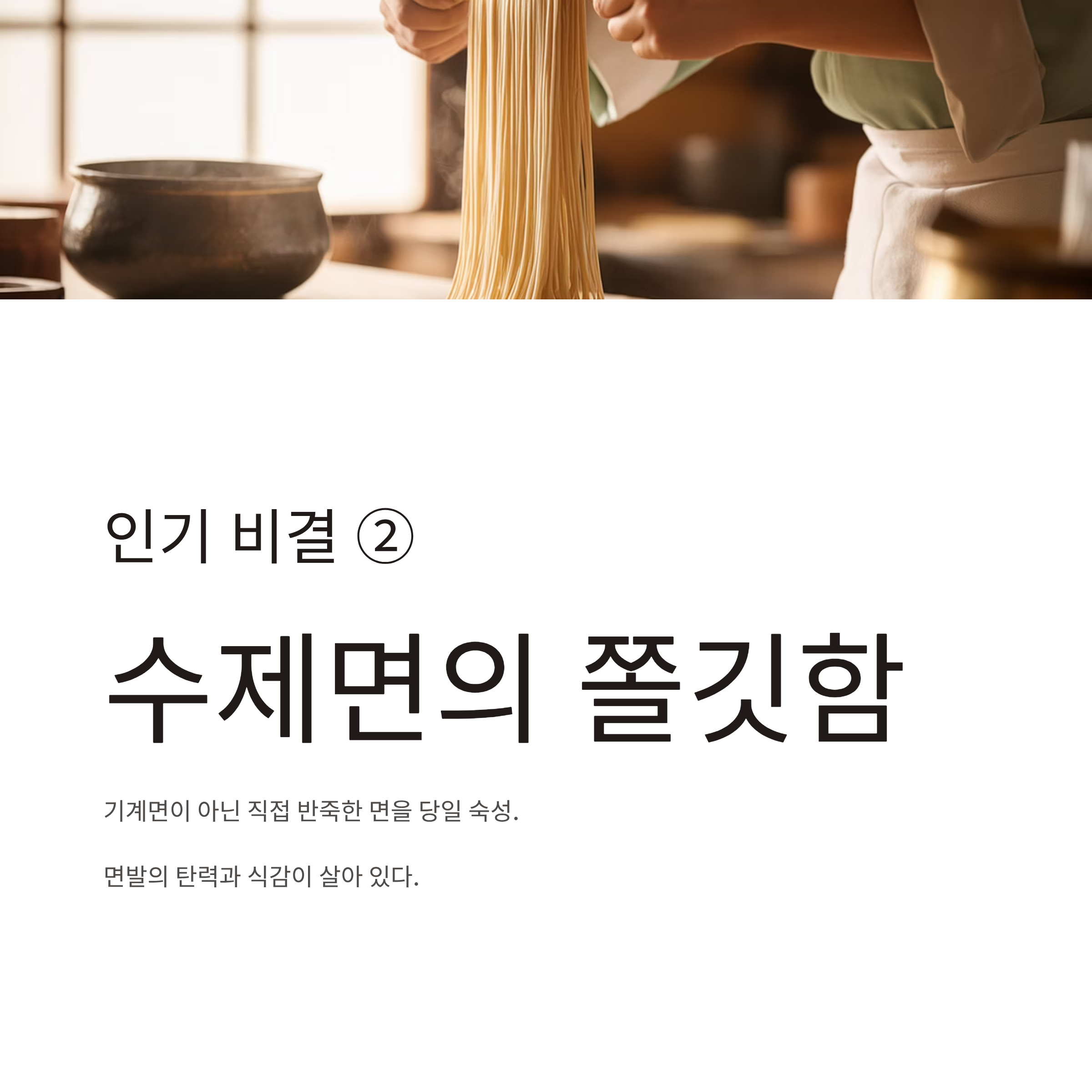 기계면이 아닌 직접 반죽한 면을 당일 숙성시켜 사용하기 때문에 면발의 탄력과 식감이 살아 있다.