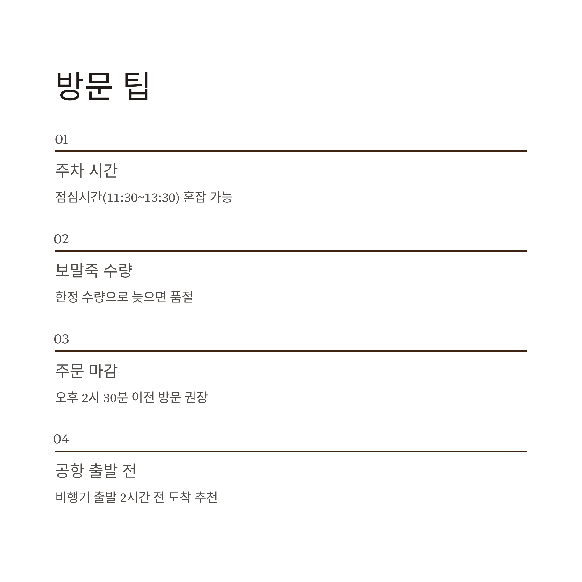 2. 보말죽은 수량이 한정되어 있어 늦게 방문하면 품절되는 경우가 있다.