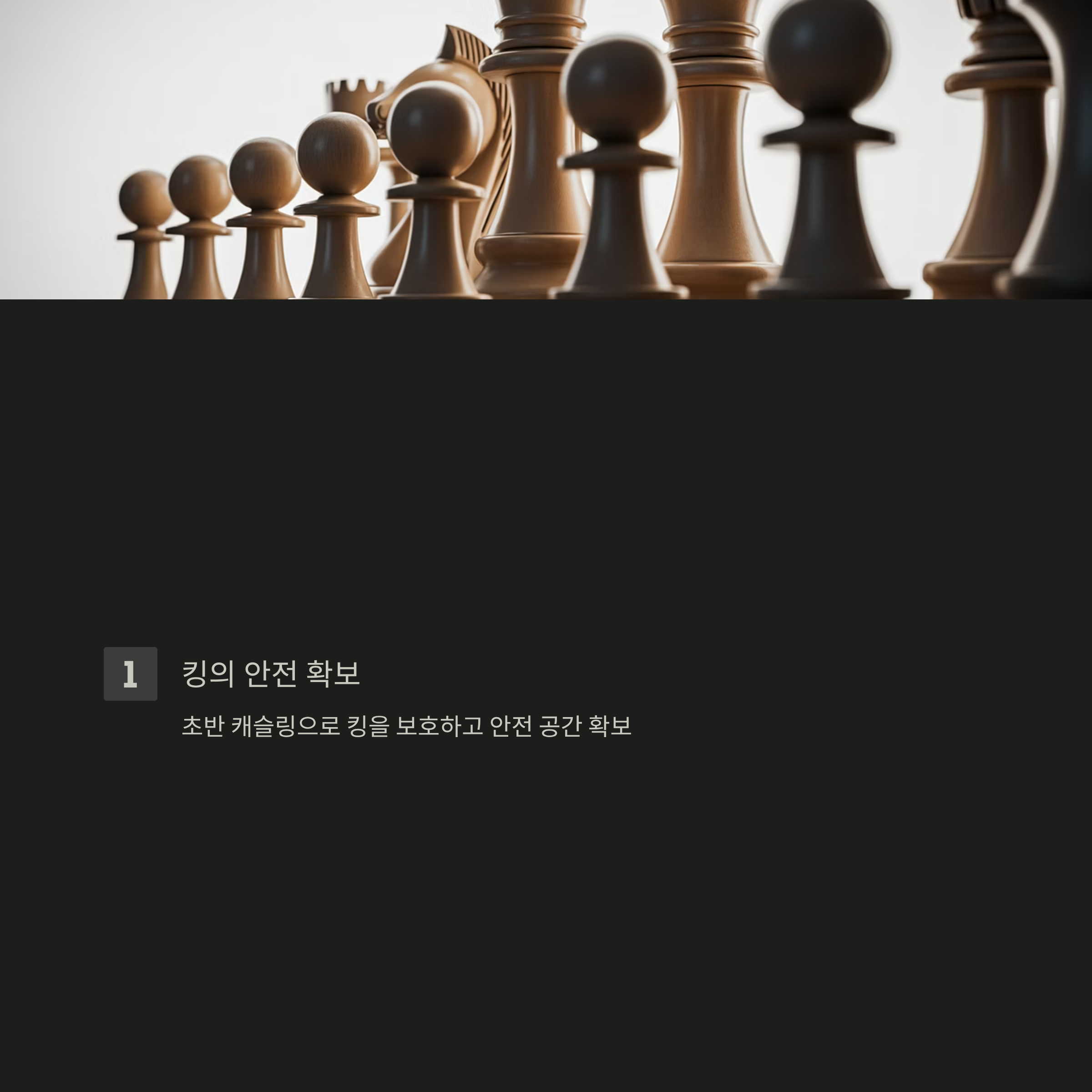 게임 초반에 캐슬링을 통해 킹을 보호하고, 안전한 공간으로 옮기는 것이 핵심이다.