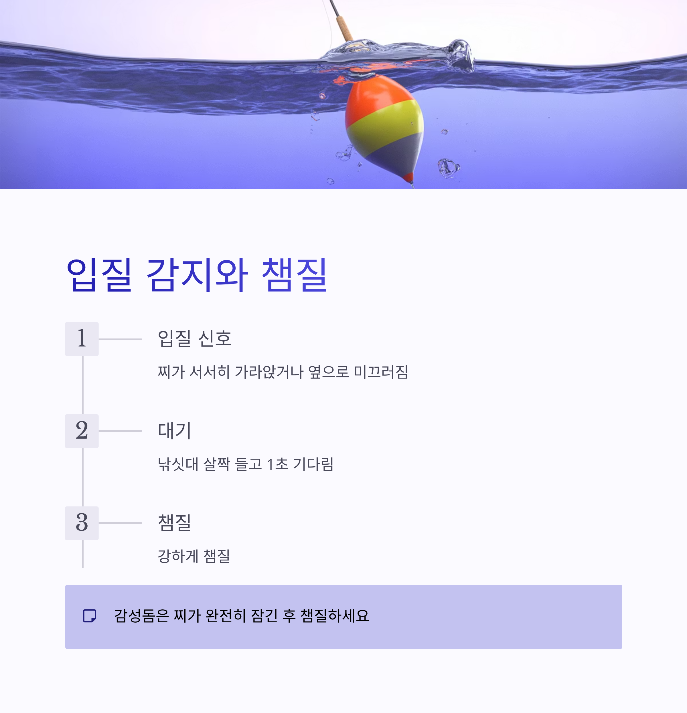 찌가 수면 아래로 서서히 가라앉거나 옆으로 미끄러질 때가 입질 신호다. 즉시 낚싯대를 살짝 들어 긴장을 풀고 1초 정도 기다린 뒤 강하게 챔질해야 한다.