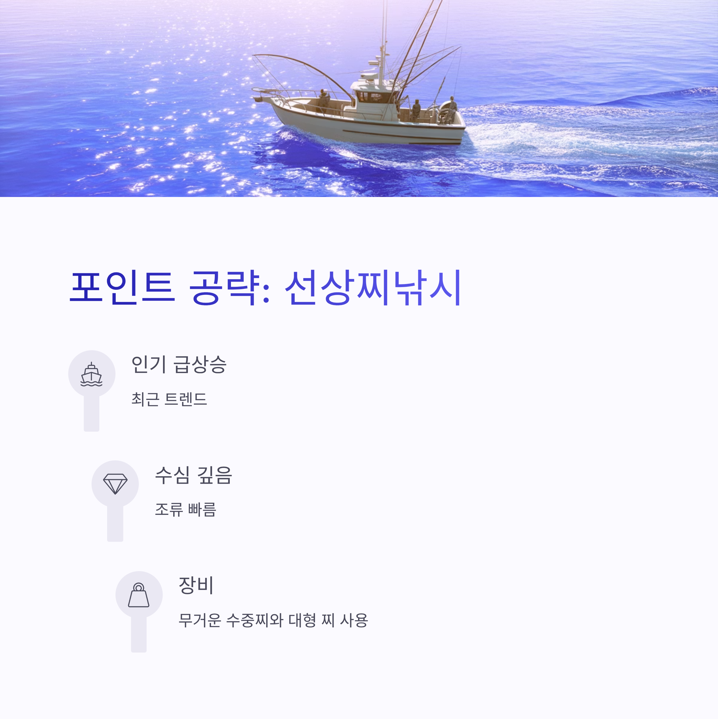 최근 인기 급상승 중이다. 선상에서는 수심이 깊고 조류가 빠르기 때문에 무거운 수중찌와 대형 찌를 사용하는 것이 좋다.