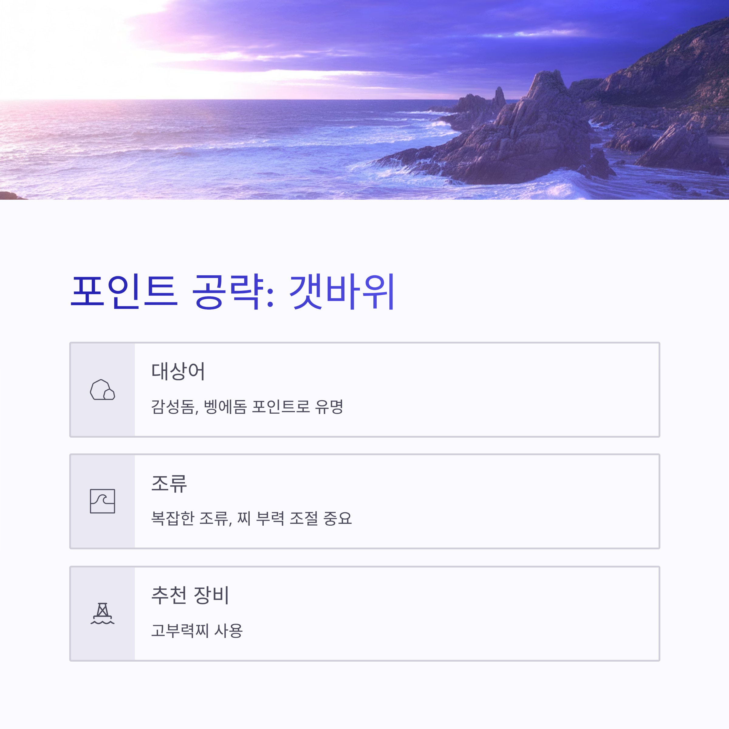 감성돔 벵에돔 포인트로 유명하다. 조류가 복잡해 찌 부력 조절이 중요하며 고부력찌를 추천한다.