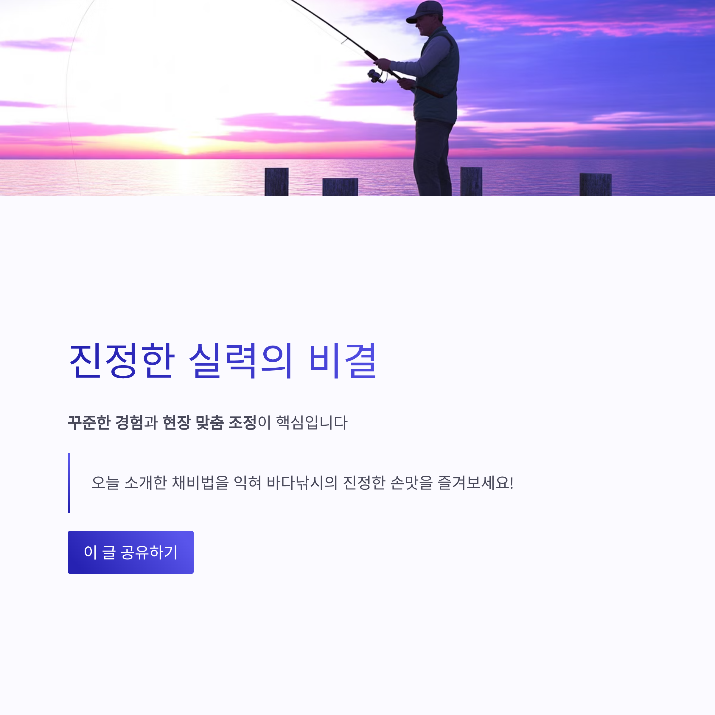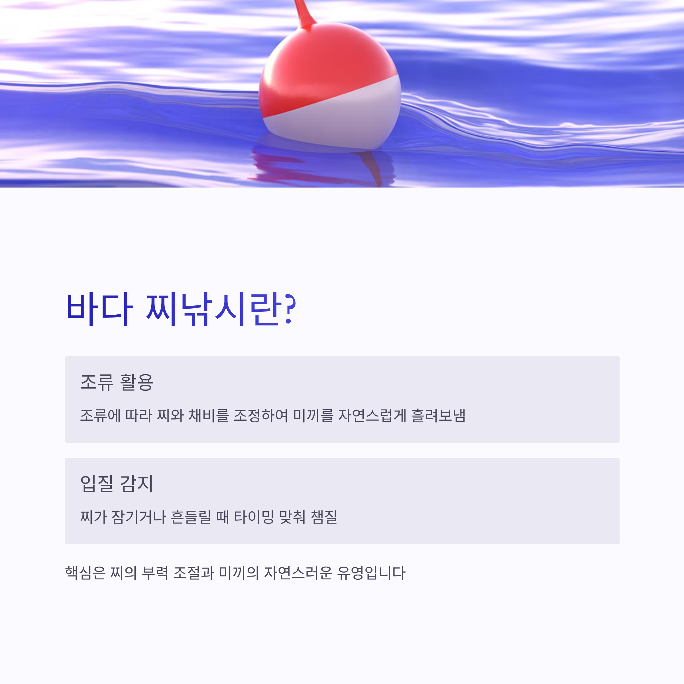 바다 찌낚시는 단순한 취미를 넘어 바다의 조류와 수심을 읽는 과학적인 낚시다. 채비를 단순하게 유지하고 부력과 수심을 정확히 조정하면 초보자도 금세 감성돔이나 벵에돔을 낚을 수 있다.