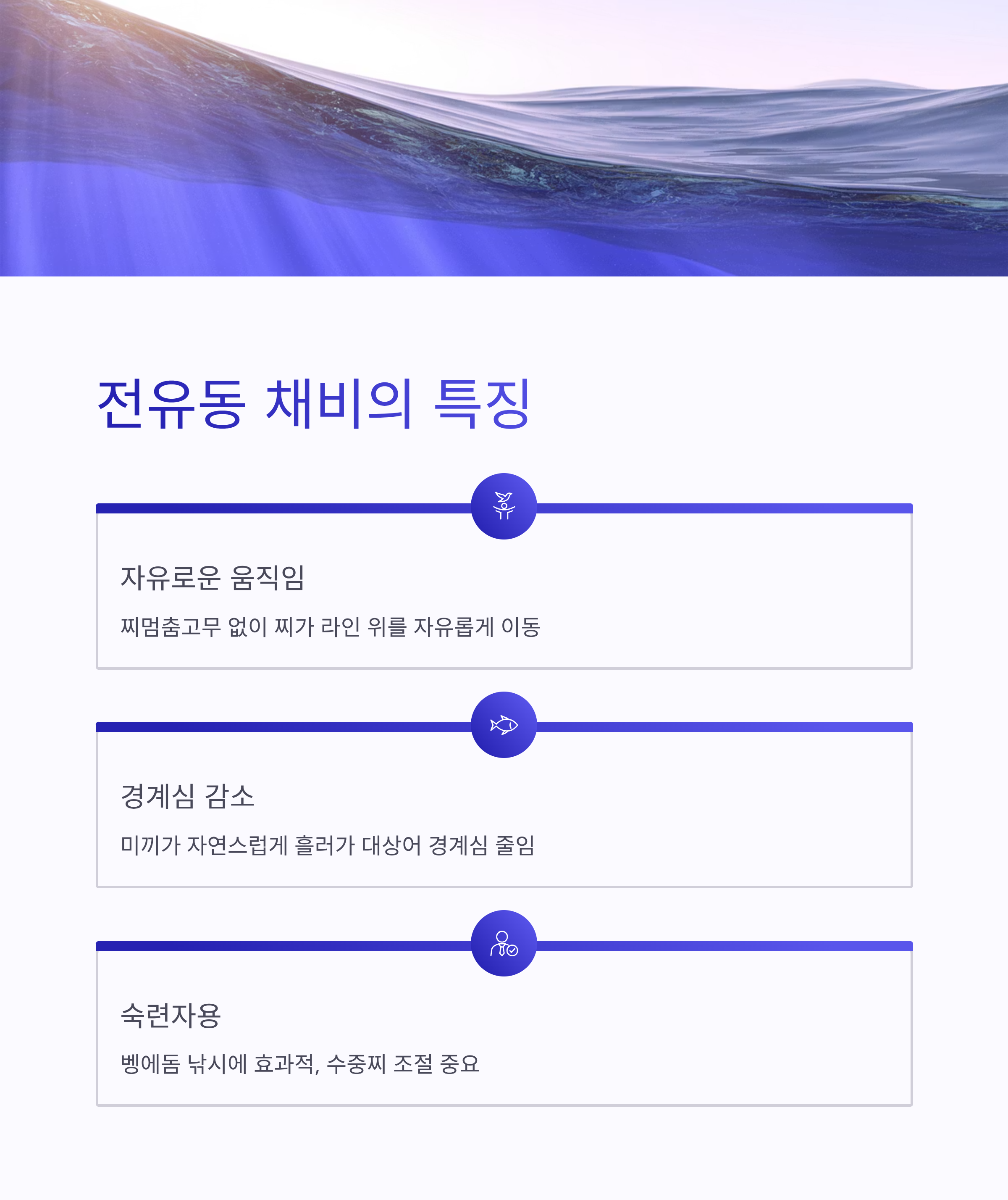 전유동 채비는 찌멈춤고무를 사용하지 않고 찌를 자유롭게 흘려보내는 방식이다. 자연스러운 미끼 움직임을 연출할 수 있어 경계심이 높은 벵에돔 낚시에 효과적이다.