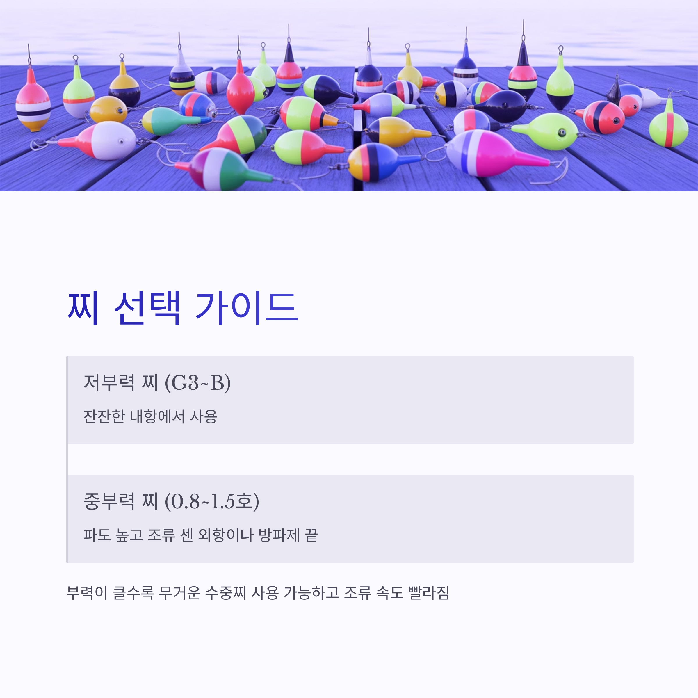 찌의 부력이 클수록 무거운 수중찌를 달 수 있고 조류를 타는 속도도 빨라진다.