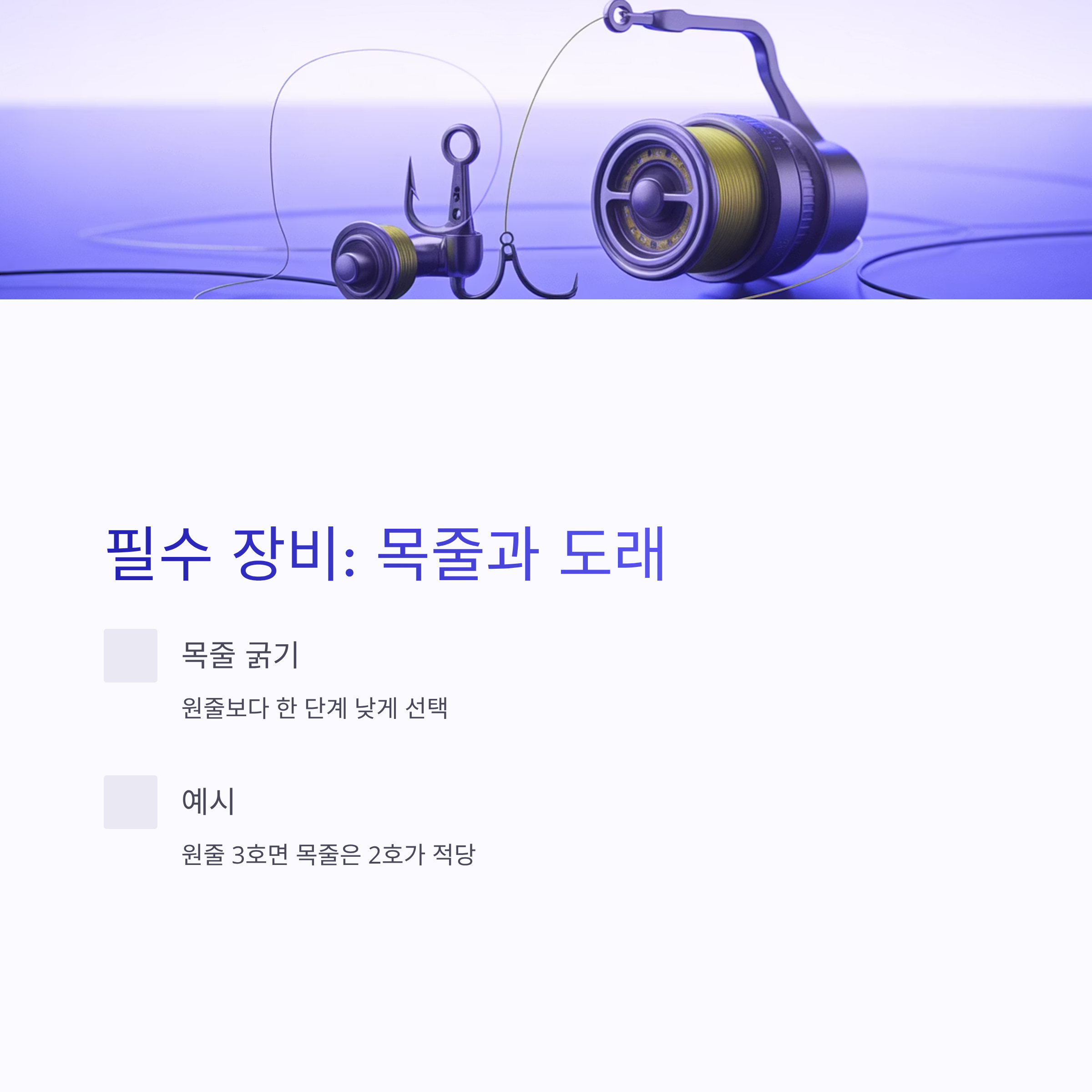 원줄보다 한 단계 낮은 굵기의 목줄을 사용한다. 예를 들어 원줄 3호라면 목줄은 2호가 적당하다.