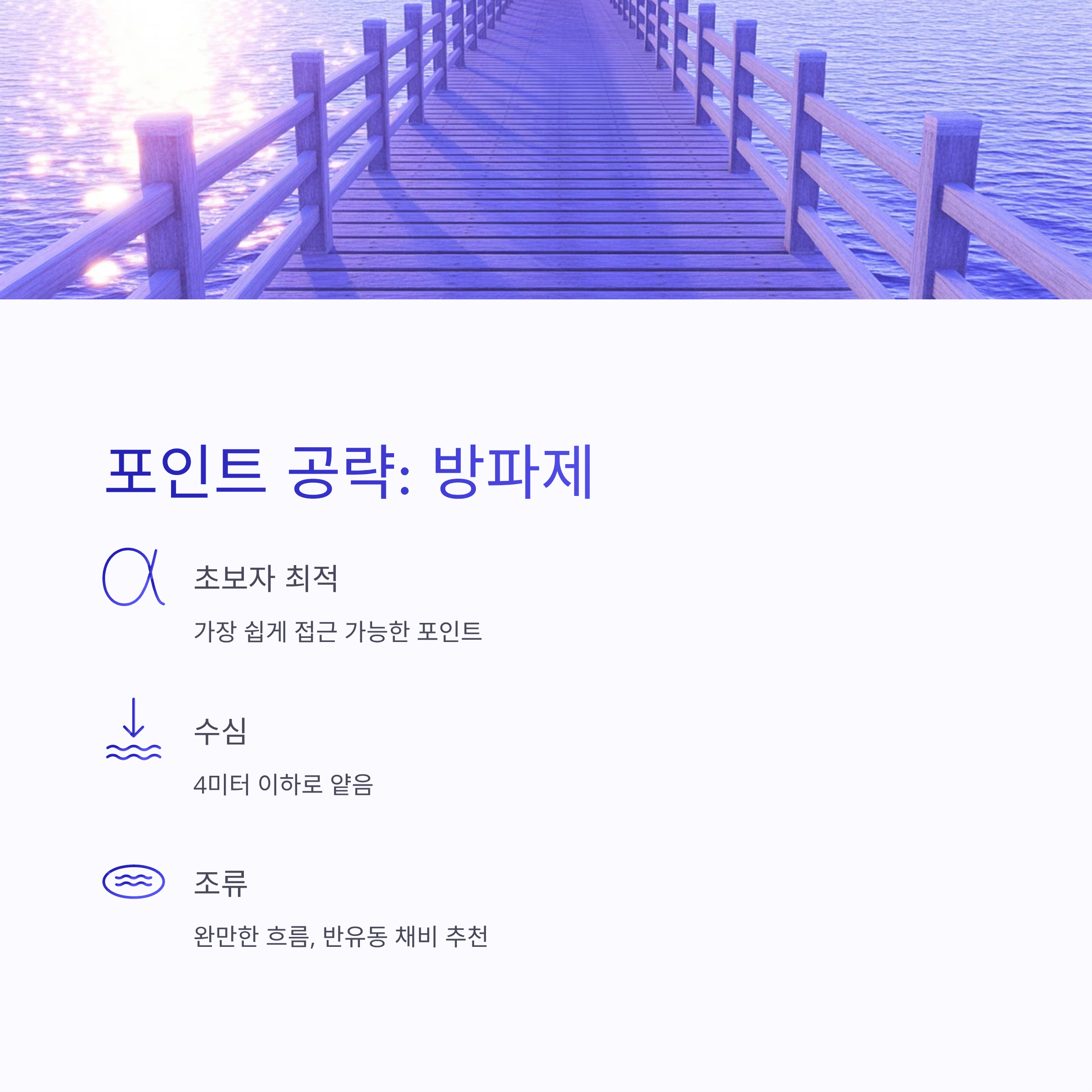 초보자가 가장 쉽게 접근할 수 있는 포인트다. 수심이 4미터 이하로 얕고 조류 흐름이 완만해 반유동 채비가 좋다.