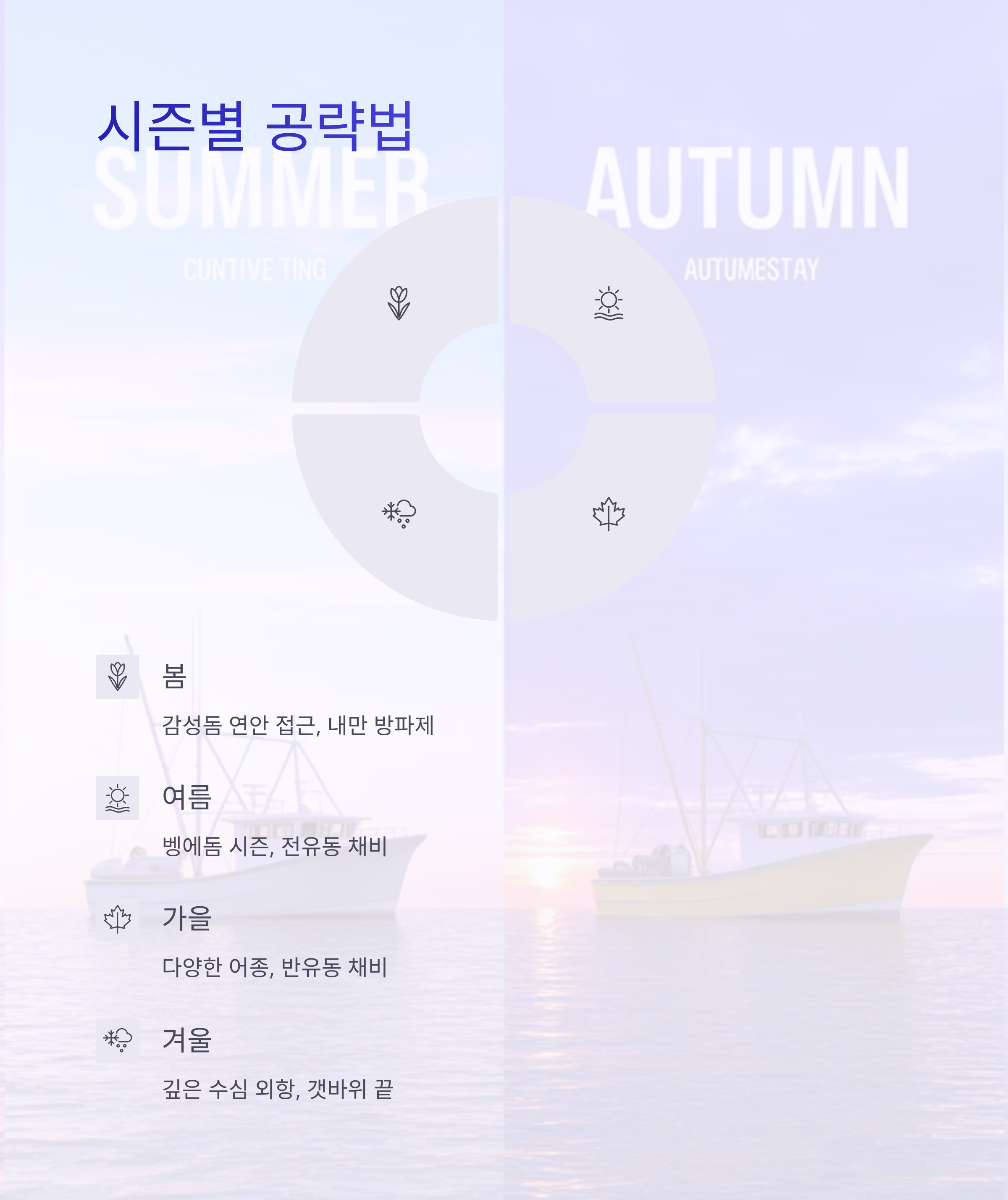 봄에는 감성돔이 연안으로 붙기 시작하며 내만 방파제가 좋다. 여름은 벵에돔 시즌으로 전유동 채비가 효과적이다. 가을에는 어종이 다양하고 입질이 활발하므로 반유동 채비로 폭넓게 공략할 수 있다. 겨울에는 수온이 낮아지기 때문에 깊은 수심의 외항이나 갯바위 끝이 유리하다.