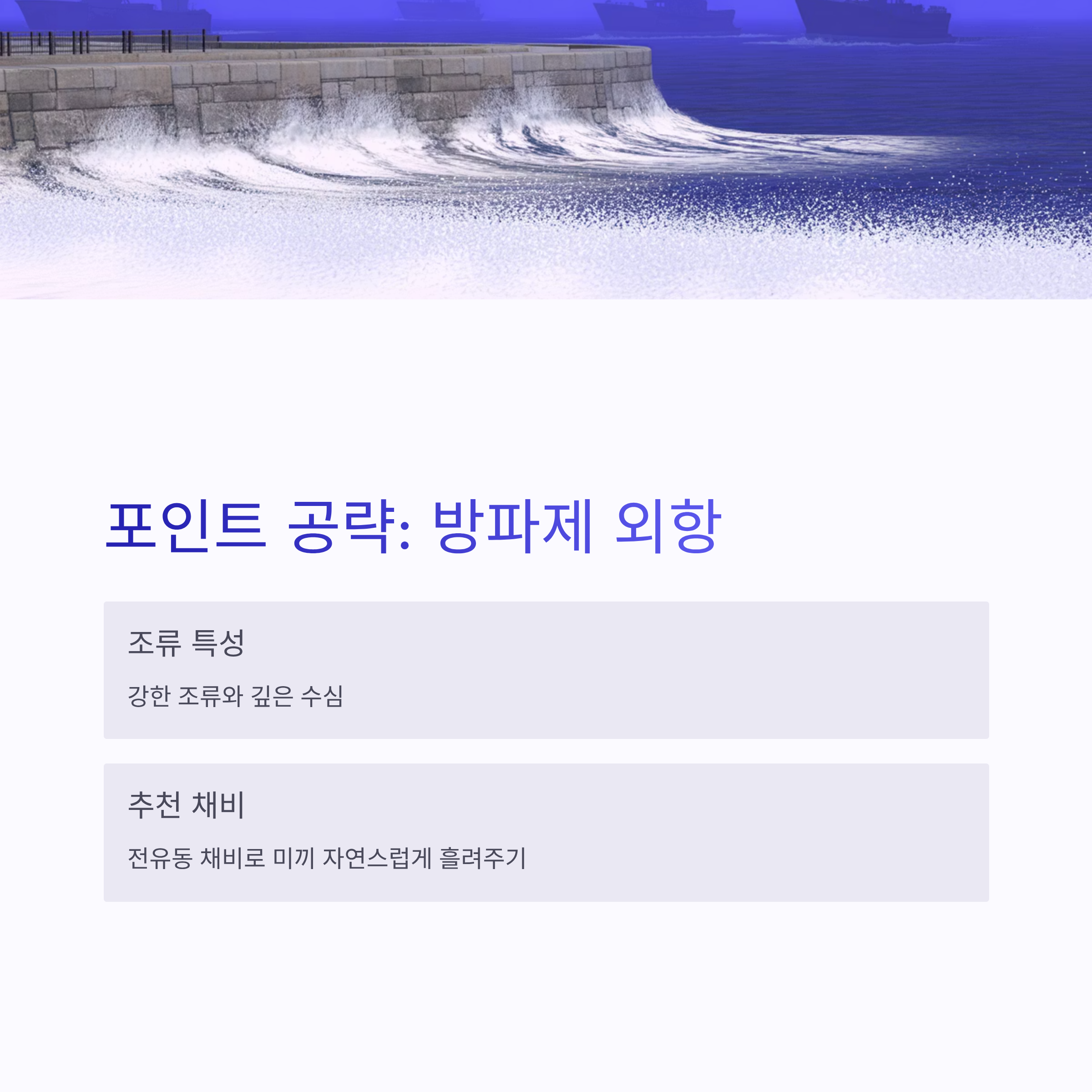 조류가 강하고 수심이 깊다. 전유동 채비를 사용해 미끼를 자연스럽게 흘려주는 것이 유리하다.