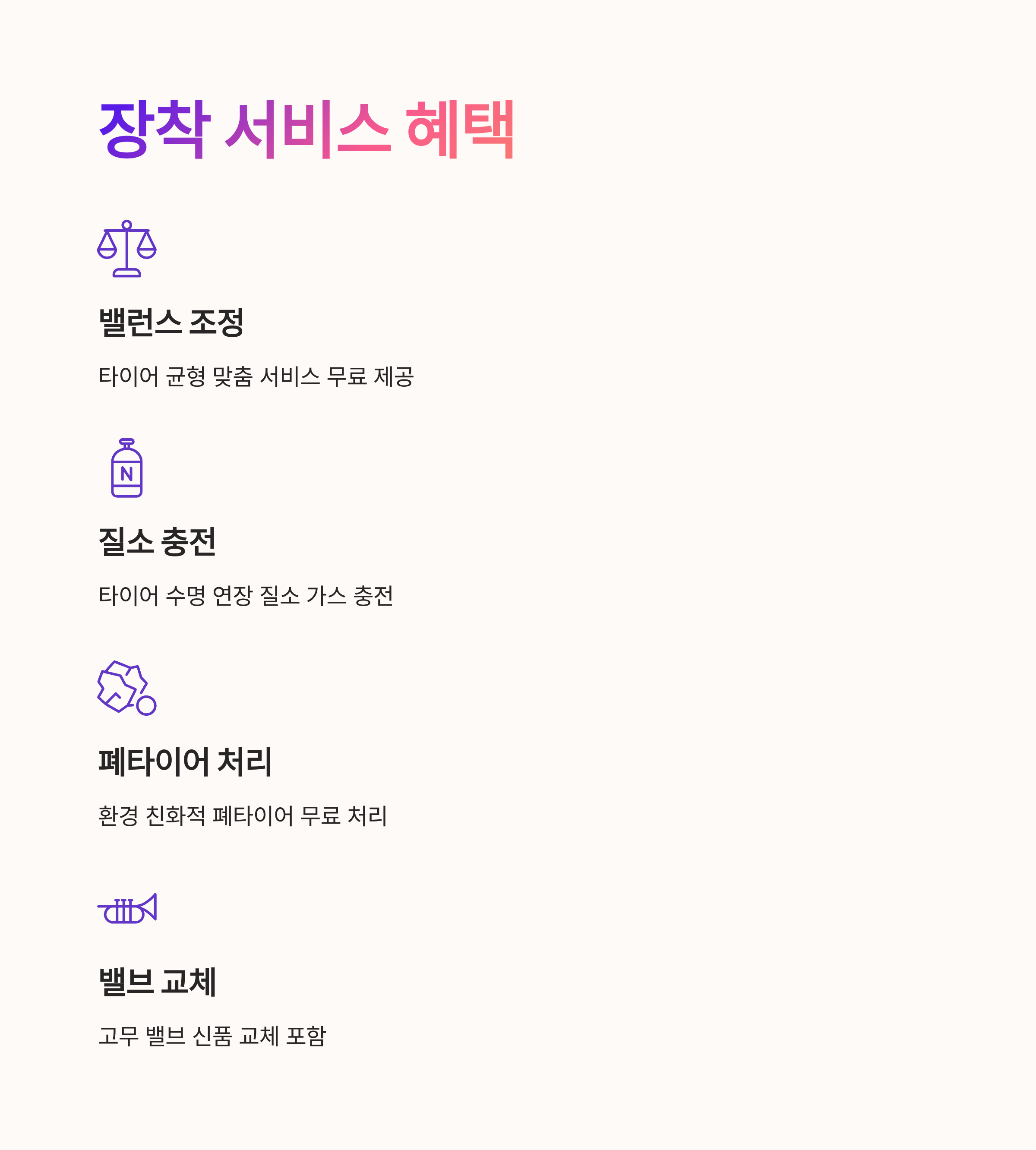 기본 서비스에는 타이어 밸런스 조정 질소 충전 폐타이어 처리 고무 밸브 교체가 포함된다. 이 모든 과정은 장착비 안에 포함되어 있으며 추가비용이 발생하지 않는다.